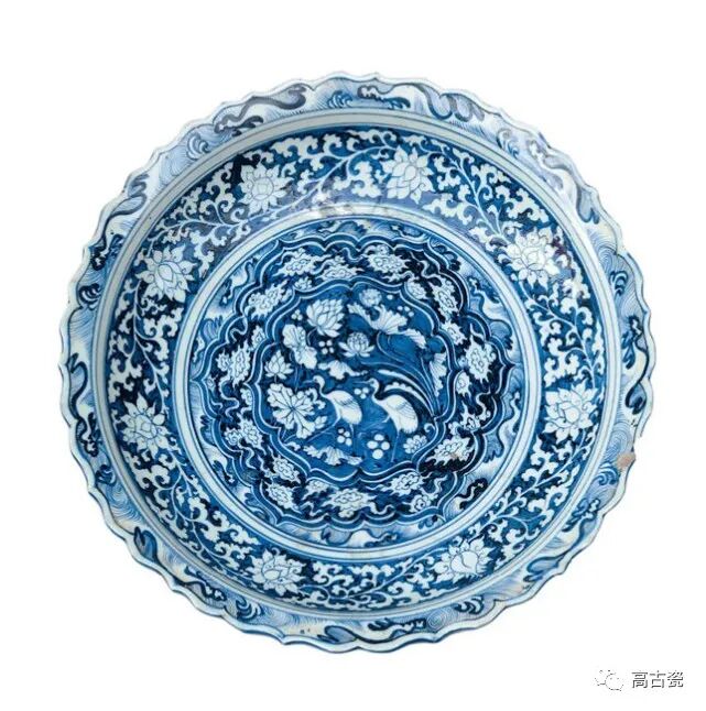 青地白花莲池水禽纹菱口盘