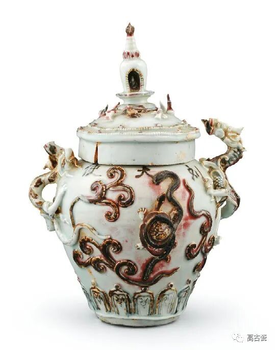 青花釉里红堆塑四灵塔式盖罐