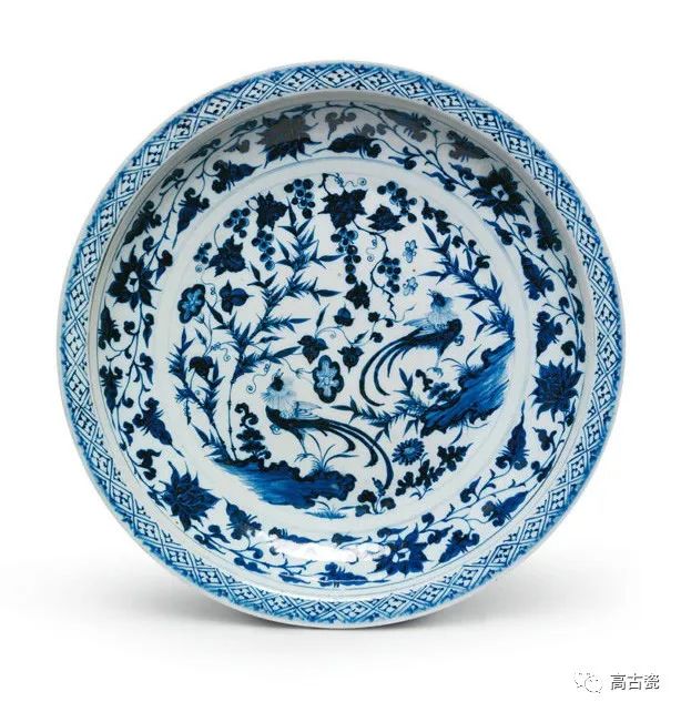 元青花中还有一路比较特殊的青地白花瓷器或蓝地白花瓷器,与青花一样都是以钴蓝料为呈色剂,青地白花瓷器比普通的白地青花瓷器更显得花纹繁密、纹样精美,更具有异域风情。而蓝地白花瓷器的钴蓝料直接熔化在釉里,色调相对深艳浓重,白色的纹样上往往还有很精细的印花,是极为珍贵的品种。