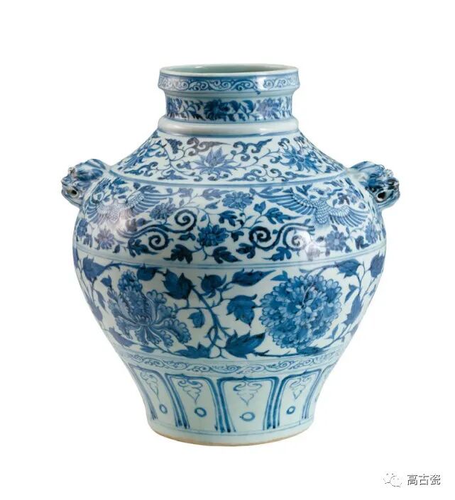 青花缠枝牡丹凤穿花卉纹兽耳罐