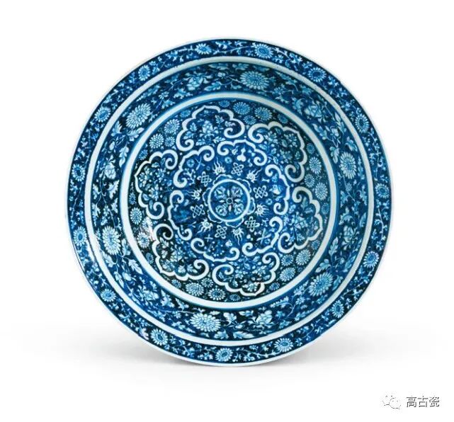 青地白花如意花卉纹盆