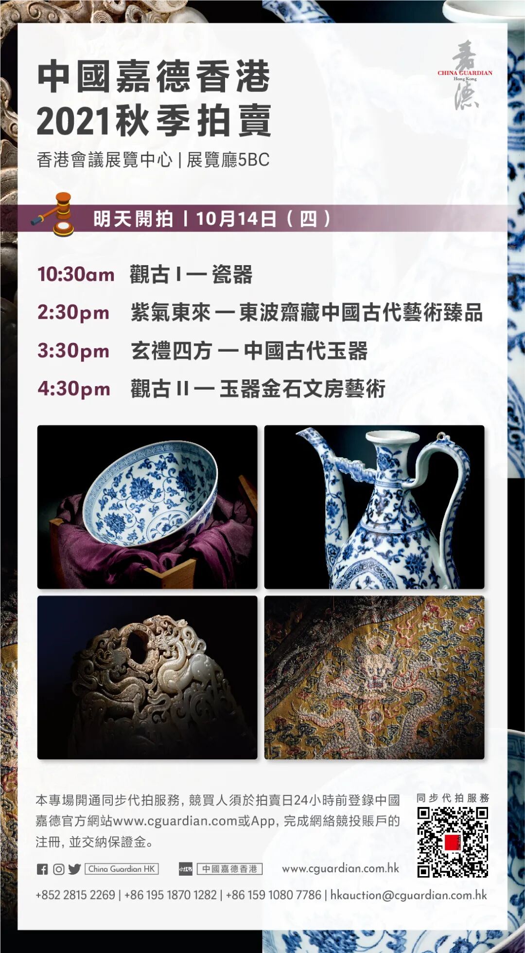 中国嘉德香港2021秋季拍卖会次日亮点频出,成交稳健!明天10月14日,瓷器工艺品四大专场「观古I——瓷器」、「紫气东来——东波斋藏中国古代艺术臻品」、「玄礼四方——中国古代玉器」及「观古II——玉器金石文房艺术」将压轴登场。在此诚挚祝愿各位藏家都能收获累累硕果,尽兴而归!