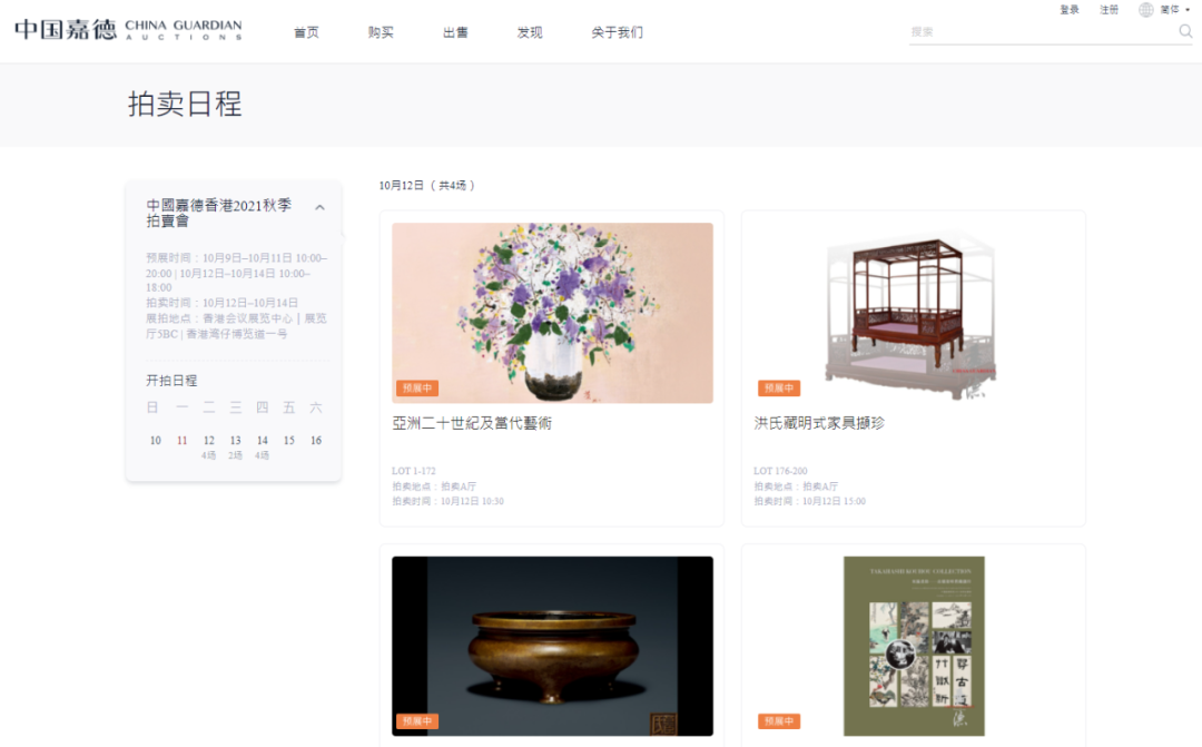 欢迎各位登录中国嘉德官方网站(www.cguardian.com),点击「购买」栏目中的「拍卖日程」, 点击「中国嘉德香港2021秋季拍卖会」,再选择相应拍场观看直播。