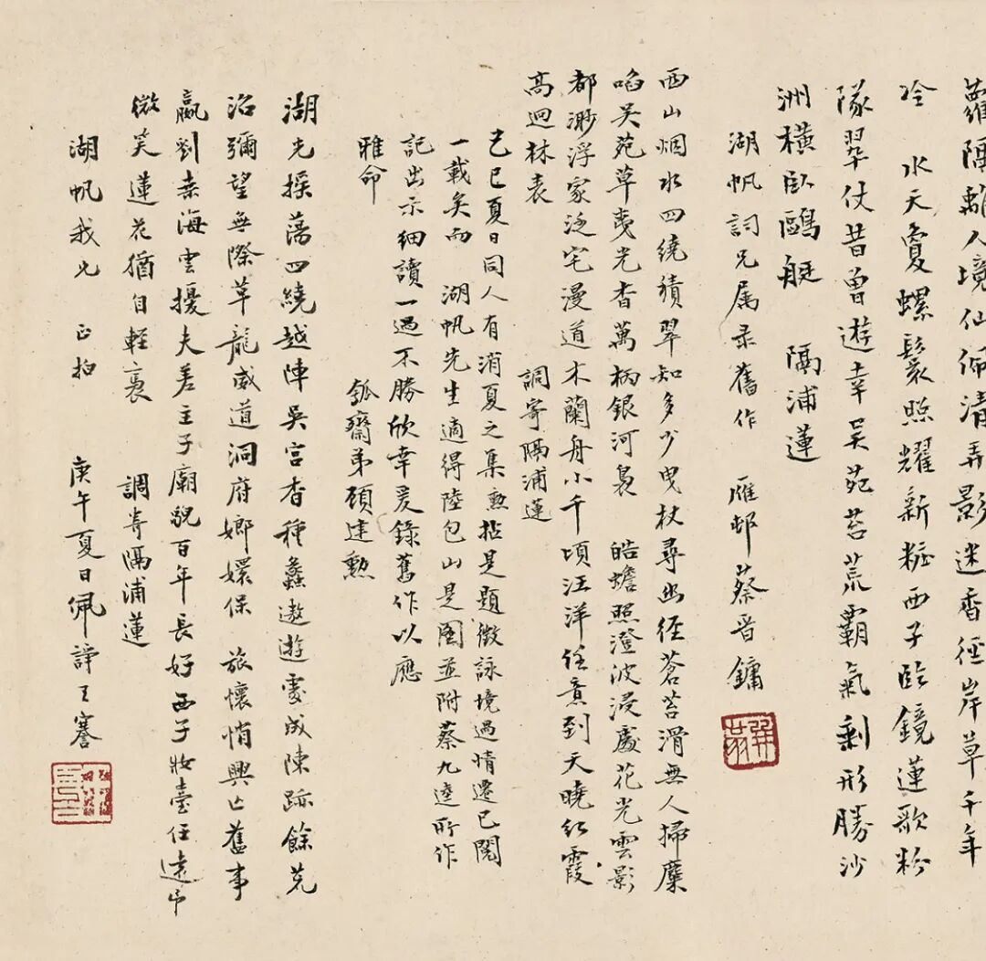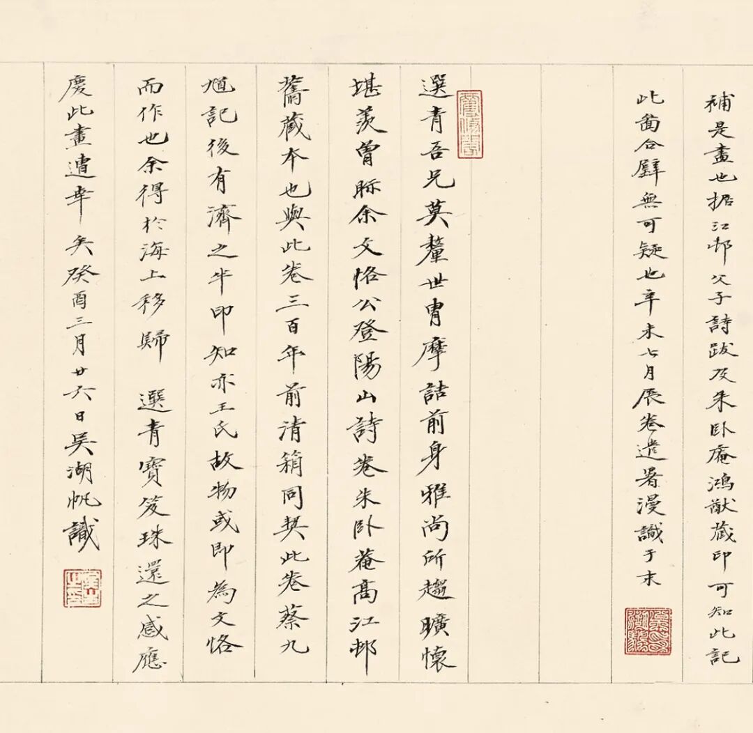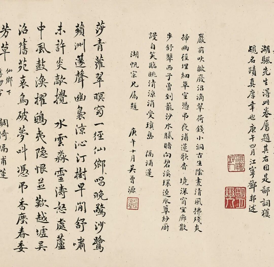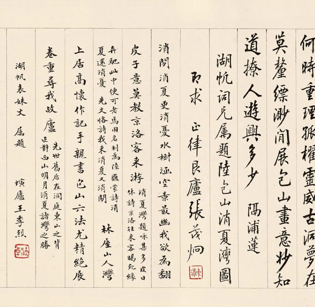 此卷经诸多名家巨眼鉴藏,呵护备至。蔡羽《销夏湾记》后有“济之”半印,盖此卷当时为同侪王鏊所有。入清,此卷先后归朱卧庵、高士奇,卷后有高士奇及其孙高岱题跋,在《江村书画目》中,此卷列于“自题上等手卷”,与诸多前代名迹并置,又有高岱外孙朱鸿猷藏印,可知是由高岱赠与,流传有序。1929年农历腊月,吴湖帆得此卷于上海,从后纸题跋中知其欣快之情溢于言表。1929年夏天,苏州地区邓邦述、吴曾源、杨俊、潘承谋、张茂炯、蔡晋镛、顾建勋、吴梅、王謇九人组织六一词社,填词消暑,事后刻有《六一消夏词》刊行。“集者九人,期以五日,历三阅月,得十八题”,其中即有《隔浦莲·消夏湾怀古》。吴湖帆得此书画合璧卷的次年,陆续邀请他们各录自作《隔浦莲》词于卷后,以示吴门文脉之流传。之后,吴湖帆又邀请王鏊的后裔王季烈、王季迁及其他友朋一同观览此卷。王季烈欣然题七绝二首,诗末说“展卷重寻我故庐”,并注:“先世旧居在洞庭东山之背,正对西山明月、消夏诸湾之胜。”1931年仲夏,王季烈妹夫何澄游太湖西山归来,吴湖帆邀他观赏此卷,当时在场即有王季迁。王季迁作为王鏊的后人,也是一代鉴藏大家,出身书香门第,年少时入梅影书屋拜吴湖帆为师,由此缘故,1933年春吴湖帆将此卷移归王季迁收藏,合浦珠还,遭际幸矣。