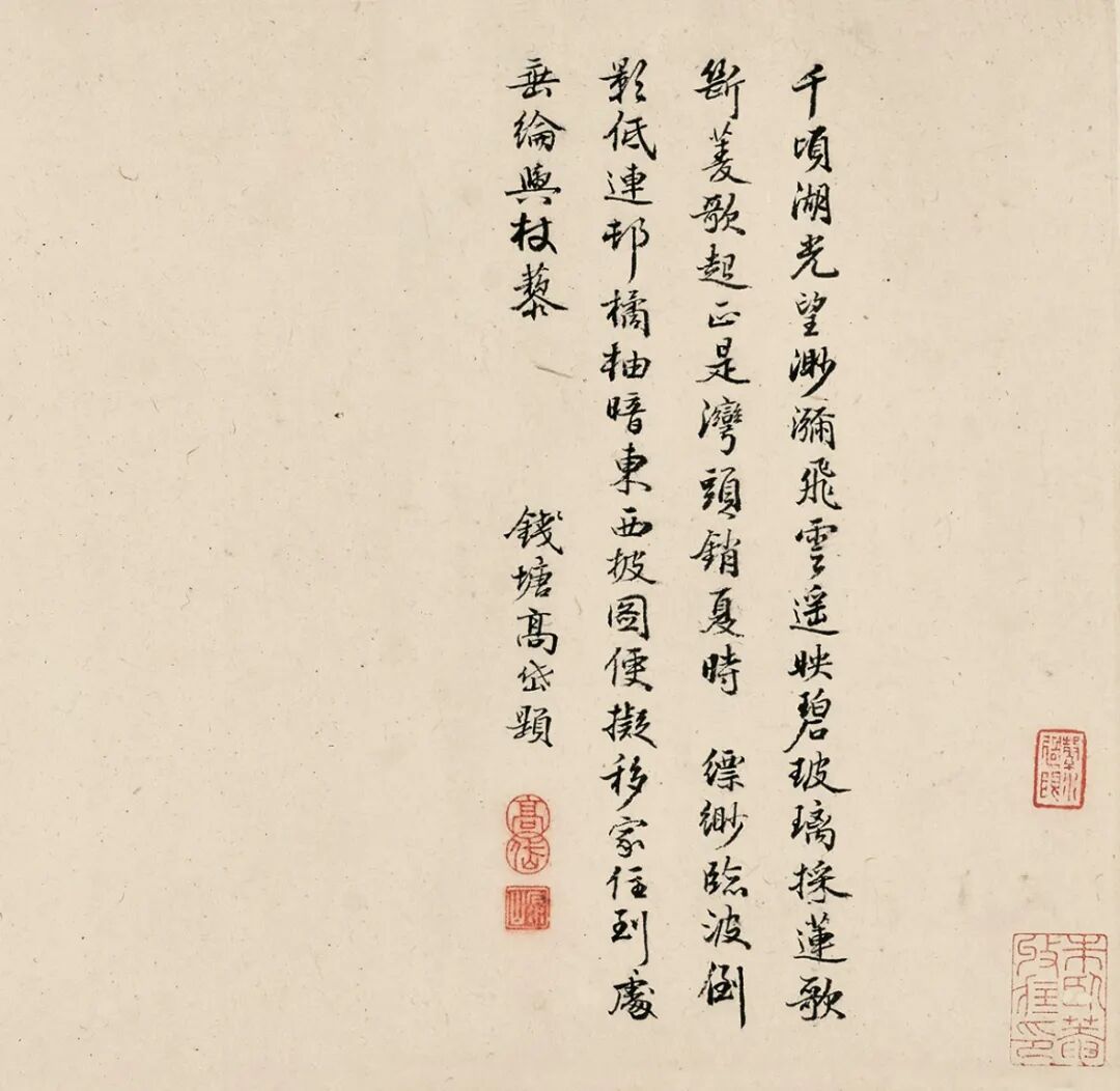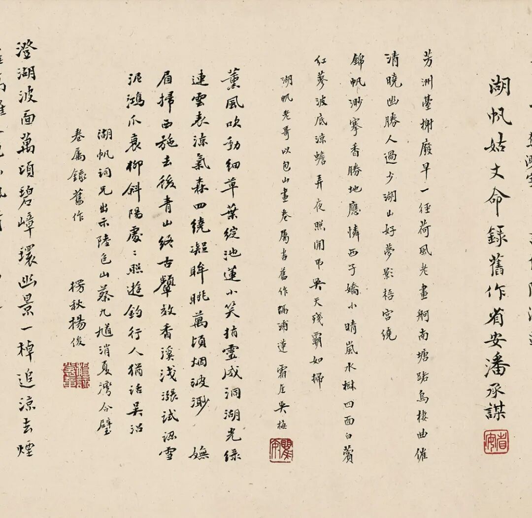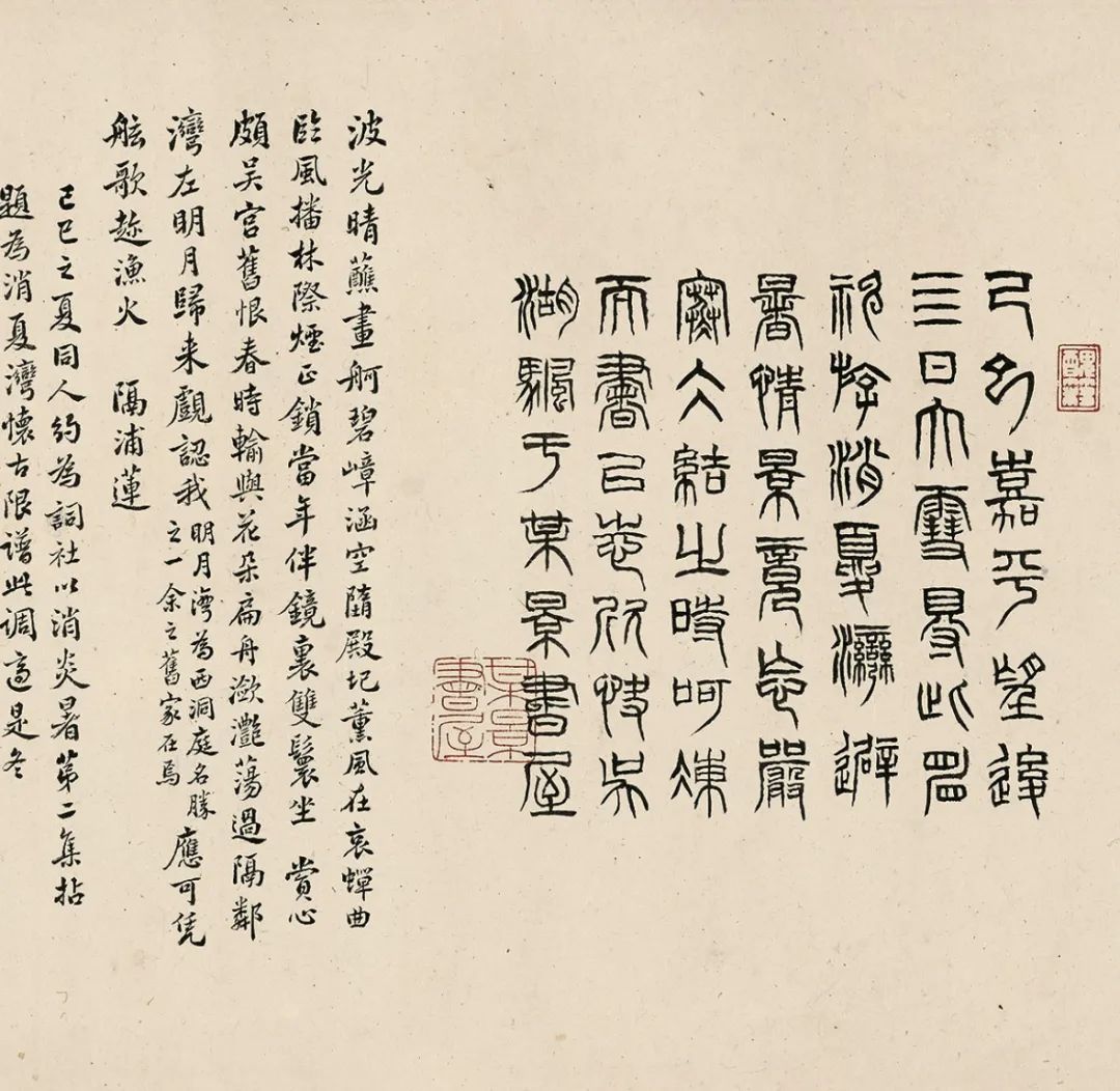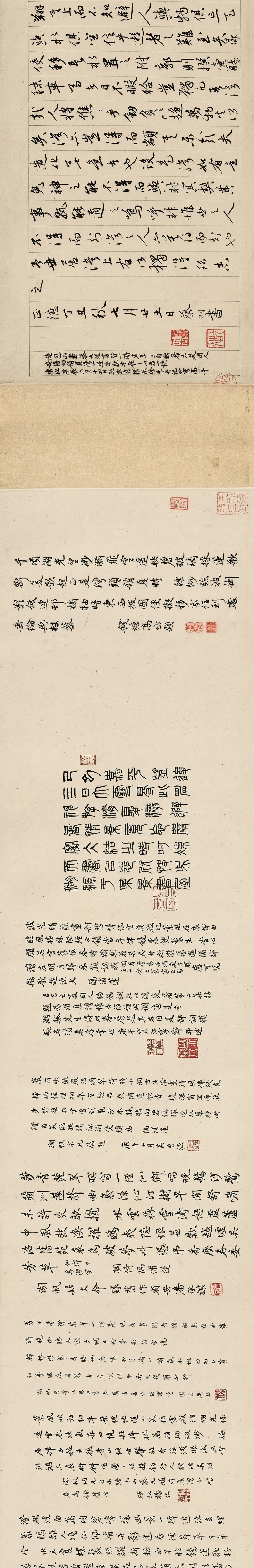 此卷经诸多名家巨眼鉴藏,呵护备至。蔡羽《销夏湾记》后有“济之”半印,盖此卷当时为同侪王鏊所有。入清,此卷先后归朱卧庵、高士奇,卷后有高士奇及其孙高岱题跋,在《江村书画目》中,此卷列于“自题上等手卷”,与诸多前代名迹并置,又有高岱外孙朱鸿猷藏印,可知是由高岱赠与,流传有序。1929年农历腊月,吴湖帆得此卷于上海,从后纸题跋中知其欣快之情溢于言表。1929年夏天,苏州地区邓邦述、吴曾源、杨俊、潘承谋、张茂炯、蔡晋镛、顾建勋、吴梅、王謇九人组织六一词社,填词消暑,事后刻有《六一消夏词》刊行。“集者九人,期以五日,历三阅月,得十八题”,其中即有《隔浦莲·消夏湾怀古》。吴湖帆得此书画合璧卷的次年,陆续邀请他们各录自作《隔浦莲》词于卷后,以示吴门文脉之流传。之后,吴湖帆又邀请王鏊的后裔王季烈、王季迁及其他友朋一同观览此卷。王季烈欣然题七绝二首,诗末说“展卷重寻我故庐”,并注:“先世旧居在洞庭东山之背,正对西山明月、消夏诸湾之胜。”1931年仲夏,王季烈妹夫何澄游太湖西山归来,吴湖帆邀他观赏此卷,当时在场即有王季迁。王季迁作为王鏊的后人,也是一代鉴藏大家,出身书香门第,年少时入梅影书屋拜吴湖帆为师,由此缘故,1933年春吴湖帆将此卷移归王季迁收藏,合浦珠还,遭际幸矣。