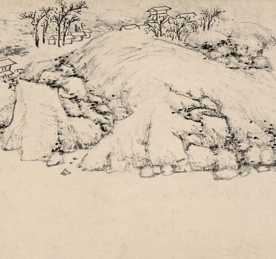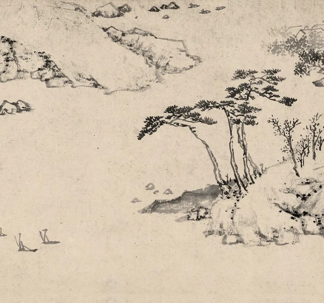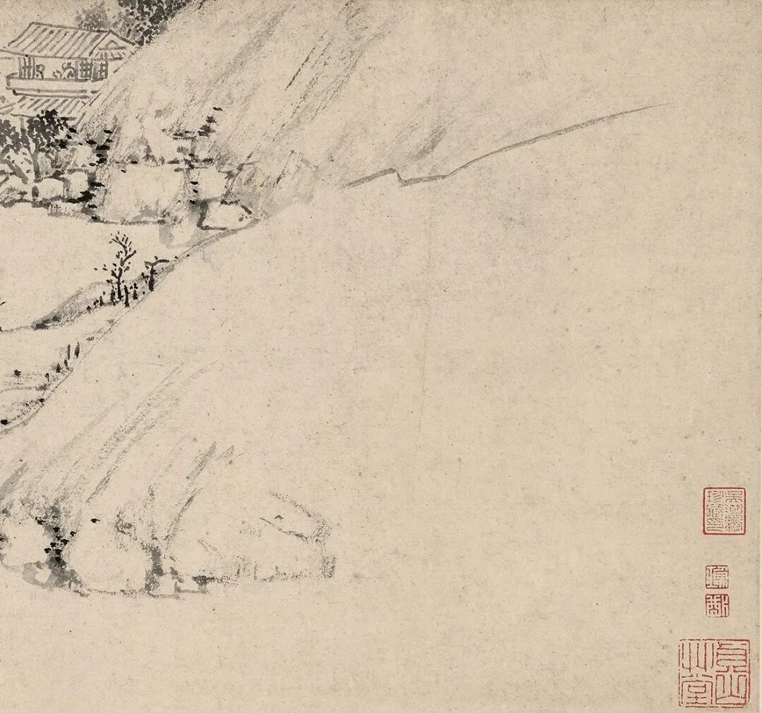 陆治这卷图画以墨笔完成,画家抓住了表现山峦物象阴阳凹凸与结构转折的关键之处,以寥寥数笔的简略手法绘出山环水抱的销夏湾景致,从右至左,乃是销夏湾与太湖衔接的河口滩渚,与地理实景吻合。在画卷右上角有一小楼,透过窗户看有二人,一人手持书卷,似是为友人诵读篇章,或是蔡羽招待文友之境况。画家手法洗练概括,着墨不多,充分利用留白,引观者遐想,远承倪云林,近接文衡山,明清之际如查梅壑诸贤简笔山水于此已现端倪。