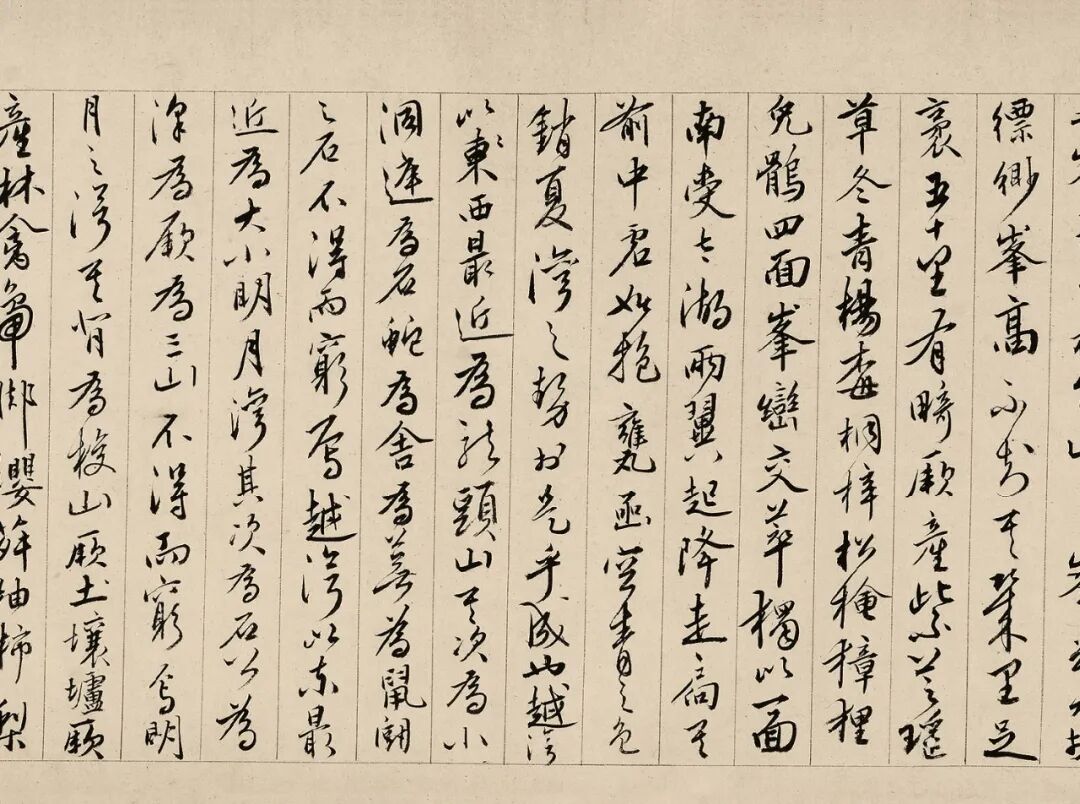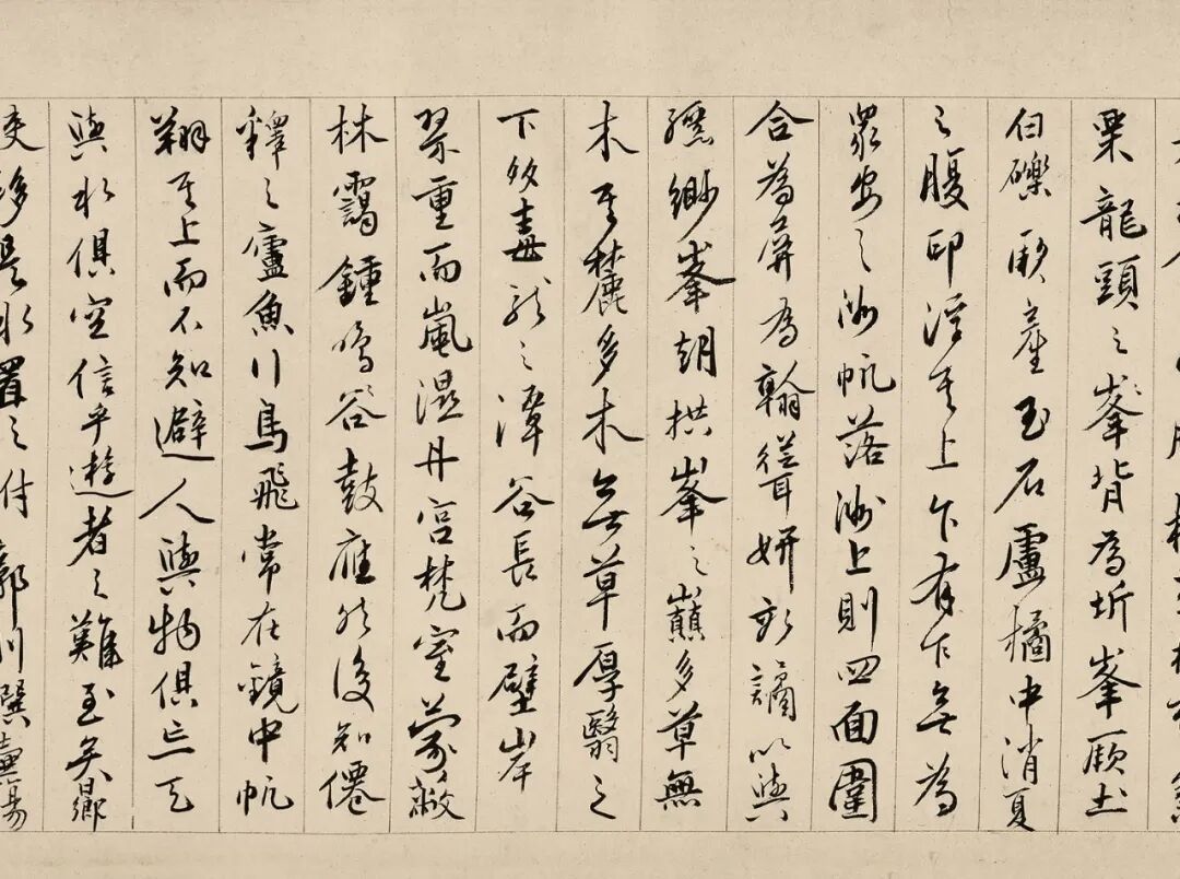 蔡羽于书法一道,亦可谓用心,曾著《书说》一篇见于《明文海》(墨迹现藏四川省博物馆),全文674字,短小精悍,以“形象喻知法”针对用笔等技法问题进行阐释,充满辩证思维。蔡羽现今存世墨迹极为稀少,博物馆中仅存数纸,以楷、行书为主,《行书临谢晋书》(现藏故宫博物院)、《行书诗》(现藏广东省博物馆)、《行草书论书》(现藏四川省博物馆)是其中篇幅较长的三件,因此这卷《销夏湾记》手卷就尤显珍贵。全卷长三尺余,通篇笔触流畅,结字俊美,墨色凝重,一气呵成。蔡羽的书法系出帖学一脉,笔画妍美,结字明显受到《集王圣教序》的影响,收放自如,有飘逸跌宕之势。王世贞曾评论道:“羽正行书亦遒劲。又云蔡书以秃笔取劲,姿尽骨全。”李日华《六研斋笔记》称“蔡林屋行狎书,遒美有逸韵。”观此卷墨迹,可称确评。正德六年(1511),王宠与其兄王守二人拜师蔡羽,在太湖西山蔡羽处从学三年,建立起深厚的师生情谊。从现今流下的墨迹来看,王宠的小楷与小行书都明显受到蔡羽书风的影响。王宠庚辰年(1520)曾游太湖西山,并作《游包山集》诗歌数篇,吟咏太湖西山诸多景点,其中亦有咏怀其师蔡羽的诗篇如《蔡师西山草堂》。现存《游包山诗》有小楷书和小行书两种不同版本,从中可见与蔡羽颇为相近,有前后承接关系,王宠个人书风面貌的渊源即在于此,王宠行笔中干净斩截的特质、错落摇摆的字形是对蔡羽书风的进一步发扬,更显丰腴秀逸。