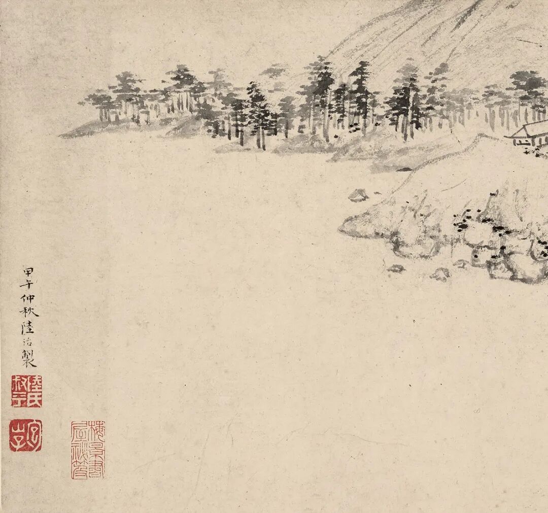 此记卷前有画家陆治补绘《销夏湾图》。陆治(1496-1576),字叔平,江苏吴县(今江苏苏州)人,少年时居住于包山,因号包山子。擅长山水、花鸟,风格雅逸,是吴门地区较有影响力的画家。嘉靖十一年壬辰(1532)六月陆治家庭发生变故,其父陆铭病故,按制应居丧三年,因此这段时间以来陆治是较为清闲的,他与师长蔡羽交游渐密,癸巳(1533)仲春时节,陆治在玄秀楼(蔡羽在销夏湾中的读书楼)画下《山静江横图》(现藏安徽省博物馆),从画中景物特征来看,与文徵明《溪山秋霁图》颇为类似,应该都是描绘销夏湾一带景物,陆治在画中着意表现了山腰环抱中的楼房,正是蔡羽读书之所。甲午(1534)仲秋制《销夏湾图》便是发生在这一背景之下,陆治或是从蔡羽处抑或其他师友处拜观了这篇《销夏湾记》手迹,随即画下此图,以增其趣。为诗文作品配图,或是为图画作品赋诗,乃是明代吴门画坛的时代风气。周臣曾为吴宽《匏庵雪咏》诗作配图,尤求应王世贞之嘱,为其所藏文徵明小楷《赵飞燕外传》配《汉宫春晓图》(现藏上海博物馆)。陆治所作,亦是如此情形。从卷后高士奇父子题跋也可得知,此记与图乃是原配,并非后世好事者裁割拆配。次年(1535)陆治为文徵明《春日漫兴》诗配《山水图》(现藏台北故宫博物院),嘉靖十八年(1539)陆治还曾为蔡羽诗歌作《书林屋诗意图册》十开(现藏台北故宫博物院),“启之幸从林屋先生得诗十章,予乃图之,则又幸附启之之册者也”。由此可见,时风所袭。