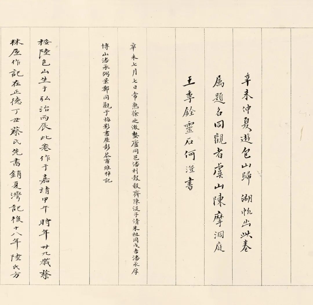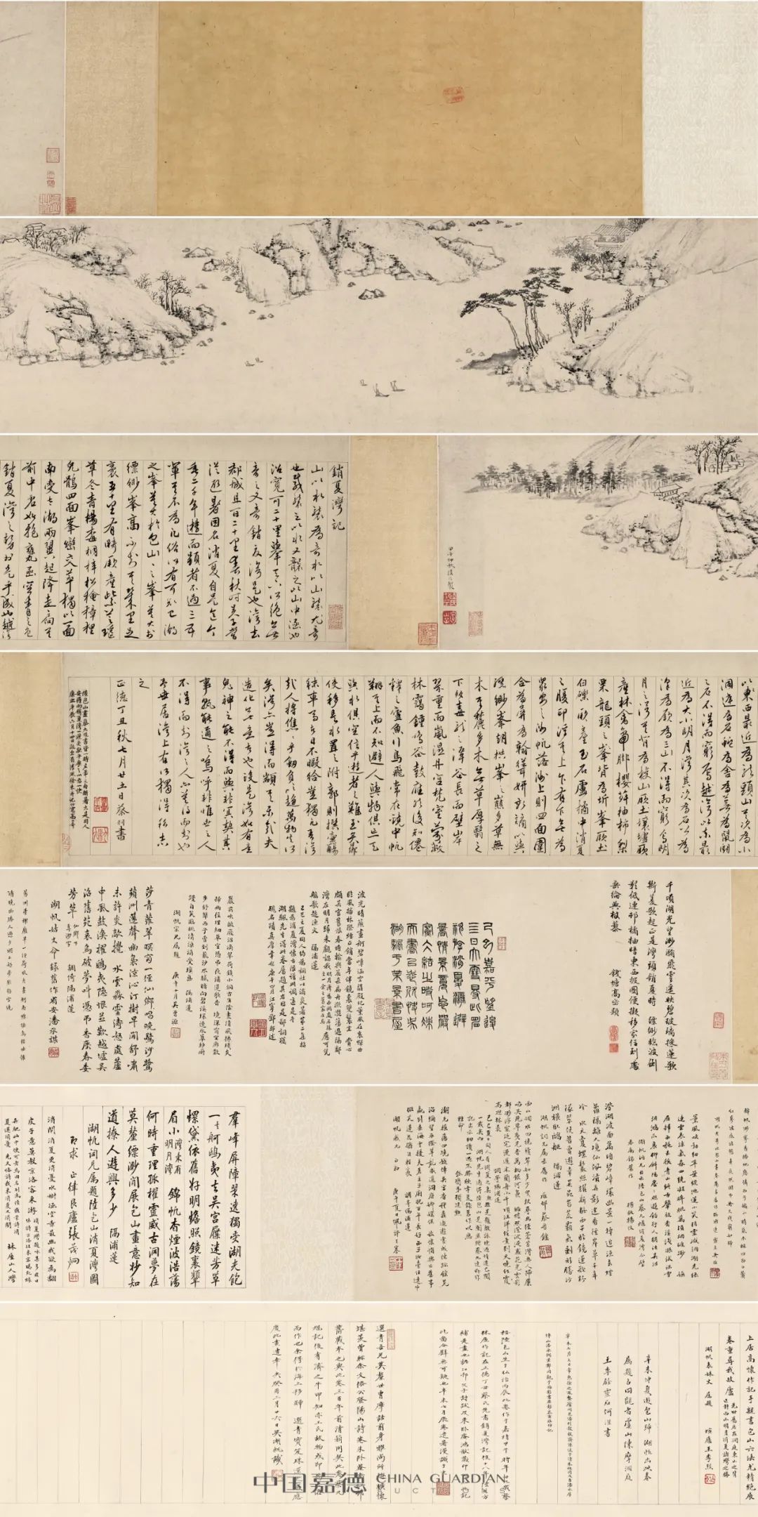 书款:正德丁丑秋七月廿五日,蔡羽书。钤印:消夏居士、九馗释文:销夏湾记。山以水袭为奇,水以山袭尤奇也。载袭之以水,又袭之以山,中涵池沼,宽可二十里,举天下所绝无,奇之又奇,销夏湾是也。湾去郡城且百二十里,春秋时吴子尝从避暑,因名消夏。自是迄今垂二千年,游而显者不过三五辈,其不为凡俗所有可知已。湖之峰莫大于包山,山之峰莫大于缥缈峰,高不知其几里,足袤五十里有畸。厥产紫芝、瑶草、冬青、杨梅、桐梓、松桧、獐狸、兔鹘。四面峰峦交萃,独以一面南受太湖,两翼起降,走扃其前,中虚如抱瓮,函空青之色,销夏湾之势于是乎成也。越湾以西,最近为龙头山,其次为小洞庭,为石蛇,为舍,为芜,为鼠斗之石,不得而穷焉。越湾以东,最近为大、小明月湾,其次为石公,为泽,为厥,为三山,不得而穷焉。明月之湾,其背为梭山,厥土壤垆,厥产林禽、鸭脚、樱、荈、柚、柿、梨、栗。龙头之背为圻峰,厥土白砾,厥产玉石、卢橘。中销夏之腹,印浮其上,乍有乍无,为众安之洲。帆落洲上,则四面围合,为屏为翰,耸妍效谲,以与缥缈峰朝拱。峰之巅多草无木,其麓多木无草,厚翳之下,多毒龙之潭。谷长而壁岸,翠重而岚湿,丹宫梵室,蒙蔽林霭,钟鸣鼓应,然后知仙释之庐。鱼行鸟飞,常在镜中,帆翔其上而不知避。人与物俱忘,天与水俱空,信乎游者之难至矣。向使移是水置之附郭,则撰壶觞秣车马者日不暇给,岂独凡吾湾哉,人将僬僬乎剑负以趋,万物失所矣,湾亦岂得而颛其乐哉!夫造化无意者也,设是湾如有意,鬼神之能不得而与,非冥契其事,熟能通之。呜呼,非惟世之人不得而知,湾之人亦莫得而知也。予世居湾上,有所独得,私志之。1.高士奇(1645-1703)题:陆包山画、蔡九馗书,皆一时名笔。三旬酷暑,大是困人,安得向销夏湾一避炎歊乎?展之以为一快。康熙庚辰(1700)六月十四日跋。忽有清风徐来,并记。竹窗高士奇。2.高岱(清康熙间)题:千顷湖光望渺弥,飞云遥映碧玻璃。采莲歌断菱歌起,正是湾头销夏时。缥缈临波倒影低,连村橘柚暗东西。披图便拟移家住,到处垂纶与杖藜。钱塘高岱题。钤印:高岱、石水山3.吴湖帆(1894-1968)题:己巳(1929年)嘉平望后四日大雪得此,愿神游消夏湾避暑情景,竟忘严寒冰结之时,呵冻而书,以志欣快。吴湖帆于梅景书屋。钤印:丑簃、梅景书屋4.吴湖帆题:按陆包山生于弘治丙辰,此卷作于嘉靖甲午,时年三十九岁。蔡林屋作记在正德丁丑,蔡氏先书销夏湾记,后十八年陆氏方补是画也。据江邨父子诗跋及朱卧庵、鸿猷藏印可知此记此图合璧,无可疑也。辛未七月展卷遣暑漫识于末。钤印:吴湖帆印5.吴湖帆题:选青吾兄莫厘世胄,摩诘前身,雅尚所趋,旷怀堪羡。曾视余文恪公登阳山诗卷,朱卧庵、高江邨旧藏本也,与此卷三百年前清箱同契。此卷蔡九馗记后有济之半印,知亦王氏故物,或即为文恪而作也。余得于海上,移归选青宝笈,珠还之感,应庆此画遭幸矣。癸酉(1933)三月廿六日吴湖帆识。钤印:双修阁、吴生之印6.王季烈(1873-1952)题:消闲消夏更消忧,水树涵空景最幽。我欲为翻皮子意,莫教京洛客来游。(消夏湾题咏甚多。皮曰休诗:京洛往来客,暍死缘奔驰。此中便可老,焉用名利为。陆龟蒙诗:消夏还消忧。先文恪诗:我来消忧又消闲。)林屋山人湾上居,高怀作记手亲书。包山六法尤精绝,展卷重寻我故庐。(先世旧居在洞庭东山之背,正对西山明月、消夏诸湾之胜。)湖帆表妹丈属题,螾庐王季烈。钤印:墙东7.何澄(1880-1946)题:辛未(1931年)仲夏游包山归,湖帆出此卷属题名。同观者虞山陈摩、洞庭王季铨,灵石何澄书。8. 彭恭甫(1897-1963)题:辛未七月七日,常熟徐之澂蛰庐、同邑潘利榖毅斋、陈湜子清、朱祖同戊吉、潘承厚博山、潘承弼景郑,同观于梅影书屋,彭恭甫维梓记。鉴藏印:济之(半印)、朱卧庵收藏印、贞山草堂、鸿·猷、朱鸿猷图书记、金氏评花庵藏、縠水过眼、吴湖帆珍藏印、梅景书屋秘笈(二次)(2印参见《中国书画家印鉴款识·朱之赤》25印,259页)签条:明陆包山销夏湾图卷真迹神品。梅影书屋秘笈。丑簃。1.清·高士奇撰《江村销夏录(江村书画目附)》,第193页(自题上等手卷),辽宁出版社,2000年。2.《吴湖帆文稿》,第413-415页,中国美术学院出版社,2004年。3.《王季迁藏中国历代名画存目》,参见《王季迁藏中国历代名画》,第597页,天津人民美术出版社,2013年。出版:《杨启霖收藏中国绘画》,第43页,亚洲文明博物馆(Asian Civilizations Museum),2000年。销夏湾在今江苏省苏州市吴中区太湖西山(又称“包山”)之麓,三面环山,中抱一湾。宋范成大《吴郡志》卷十八云:“销夏湾,在太湖洞庭西山之趾,山十余里绕之。旧传吴王避暑处。周围湖水一湾,冰色澄徹,寒光逼人,真可消夏也。”《苏州府志》曰:“水口阔三里,深九里,烟萝塞望,水树涵空,杳若仙乡,殆非人境。”相传春秋时吴王夫差不耐暑热,携西施避暑此处,故得名。道教第九洞天林屋洞也在此地。早在唐代,销夏湾已经进入了文人视野,皮日休、陆龟蒙等著名诗人都留下歌咏销夏湾的诗篇。明代以来,吴门众多名流雅士都曾造访此地消夏避暑、吟赏流连,吴门著名的文人书画家蔡羽、陆治更是长居于此。