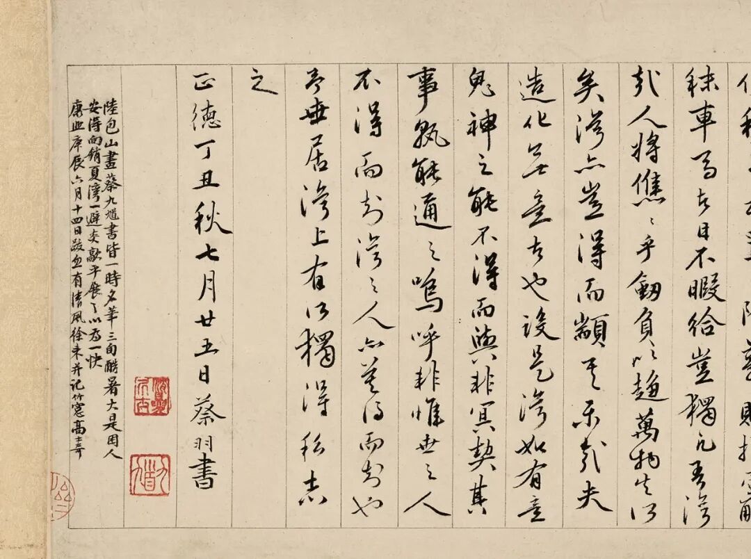 蔡羽曾作洞庭诸记,颇受赞誉。正德十一年丁丑(1517)秋七月廿五日,蔡羽展卷誊录自作《销夏湾记》。不久后的八月二十日,王鏊携弟侄辈泛太湖遇大雨,遂夜宿销夏湾蔡羽舍内,并赋诗以纪之。兴许此间,王鏊见到了这卷神采洒落的墨迹,索求而归,亦未可知。“秀才人情半张纸”,文人之间互赠翰墨本是常事,同年文徵明还曾为蔡羽画《溪山深雪图》(现藏台北故宫博物院),乃是两人友谊的重要见证。