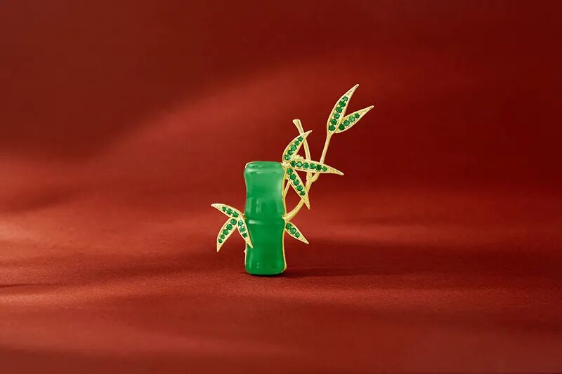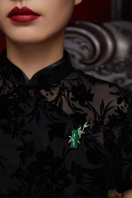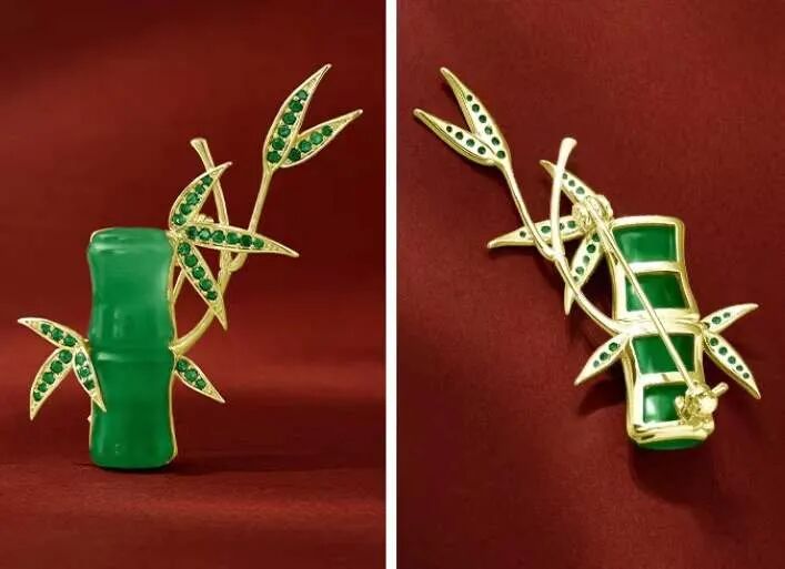 玉竹胸针,主体由晶莹透亮的绿玉髓构成,四周用竹叶进行点缀,使得整体造型更加立体。淡雅的竹青色,大气唯美,看着它,一下子就理解了苏东坡“宁可食无肉,不可居无竹。”的心境。哪怕只是穿了一件平平无奇的毛衣,只要佩戴上玉竹胸针,都一下子犹如点睛之笔,使人气质变得虚怀若谷,高风亮节。![]()