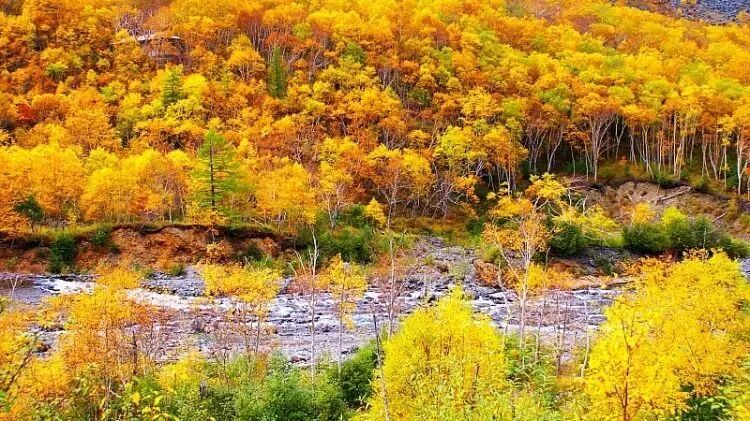 森林深处,高耸挺拔的常绿松柏、满身金黄的落叶松、开满粉黄树叶的白桦、姹紫嫣红的灌木丛一起组成了一幅金秋油画。