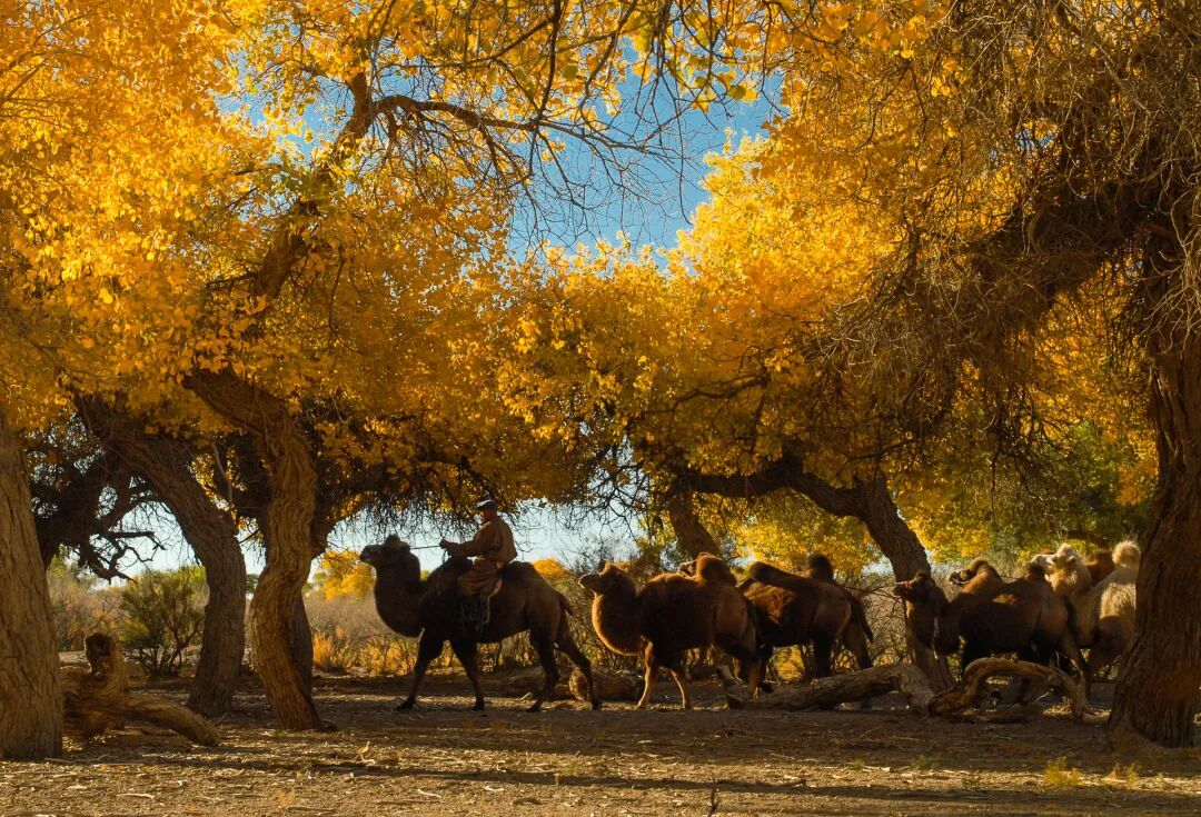 金秋十月,这里的胡杨就会由浓绿变为金黄,如同苍茫中燃烧的火焰,似乎将整个沙漠都染成了金色,令人感受到大自然的美丽和生命的顽强。