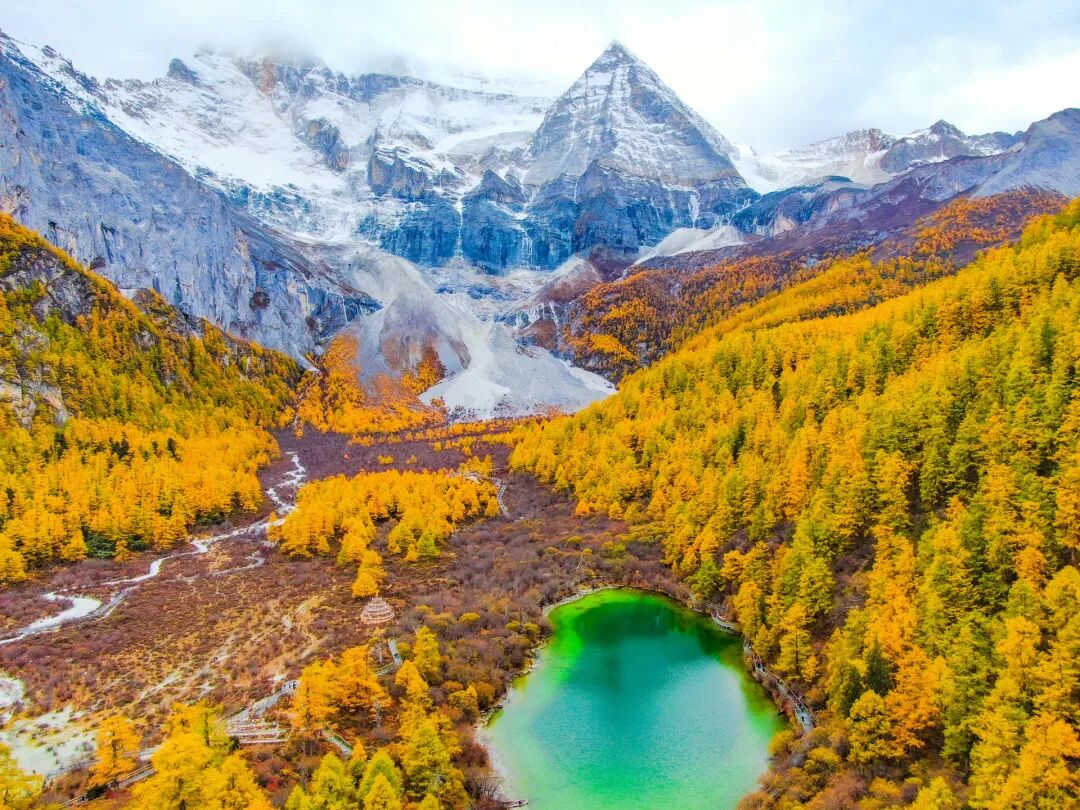 清澈透亮的海子,洁白高远的雪山、青黄相间的白桦林、连绵不断的山峦以及藏寨和牛羊所组成的一幅幅绝美梦幻的画卷。