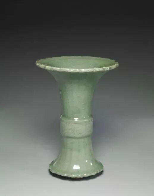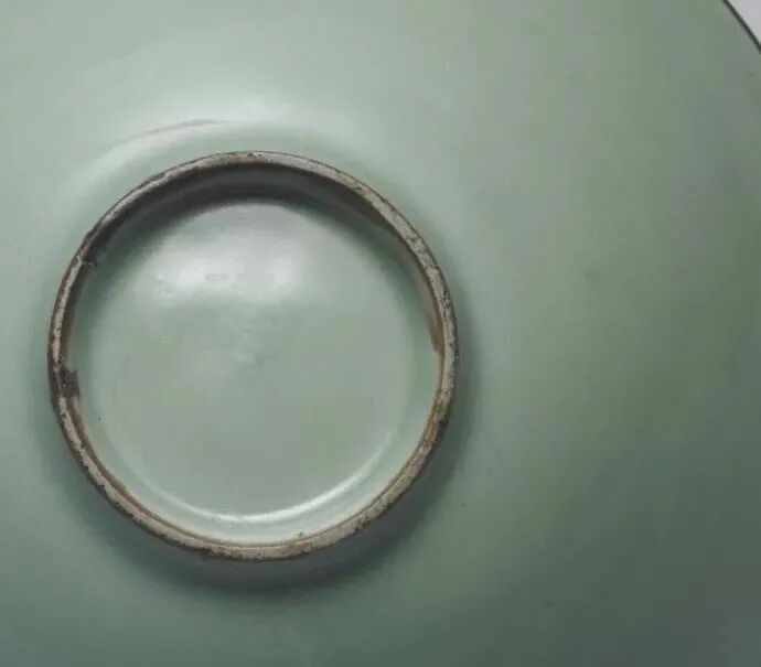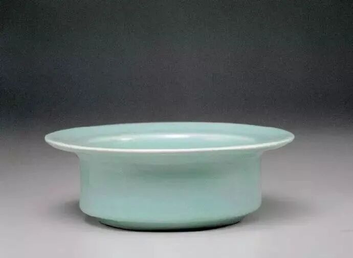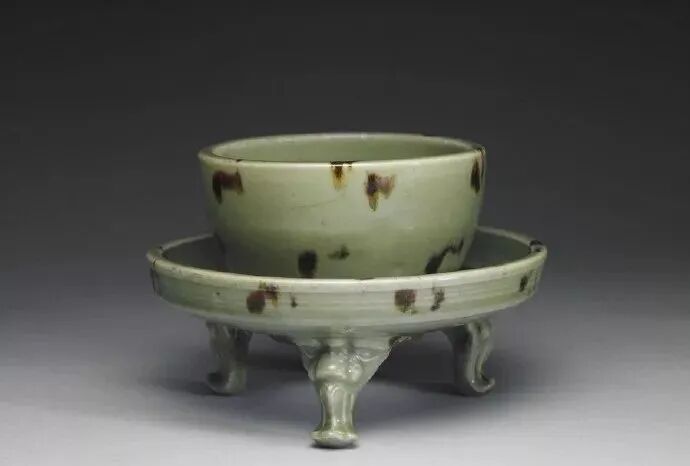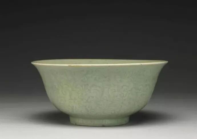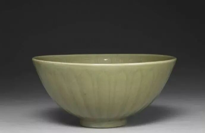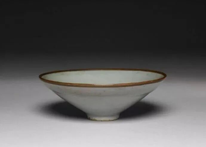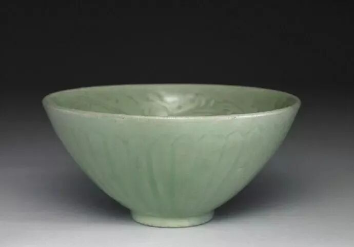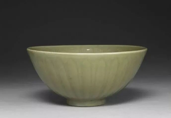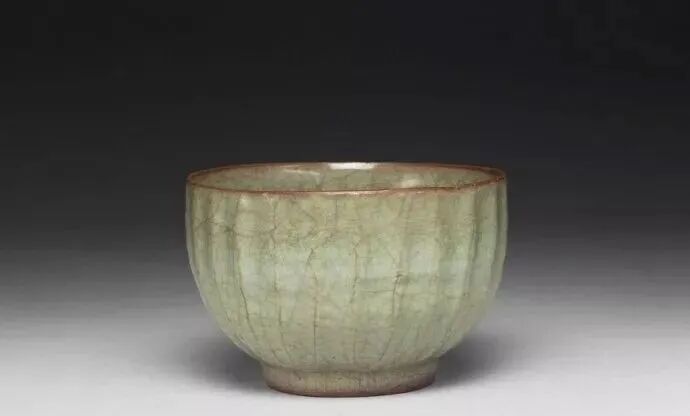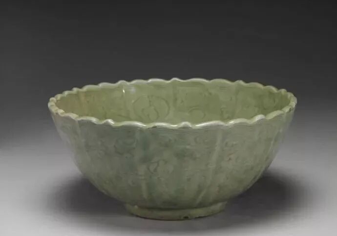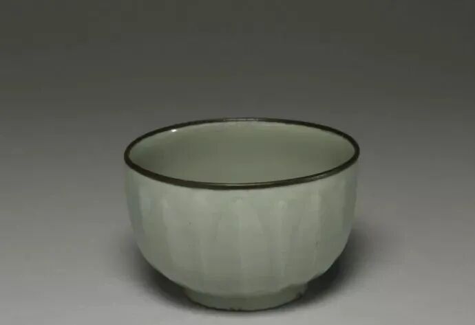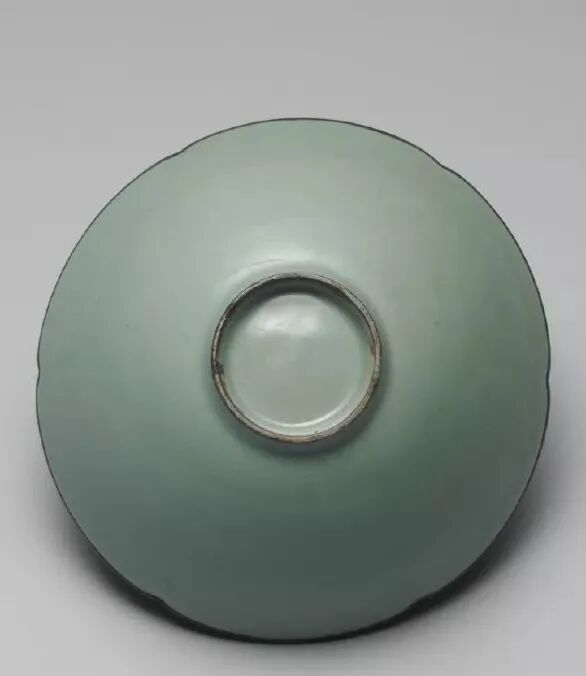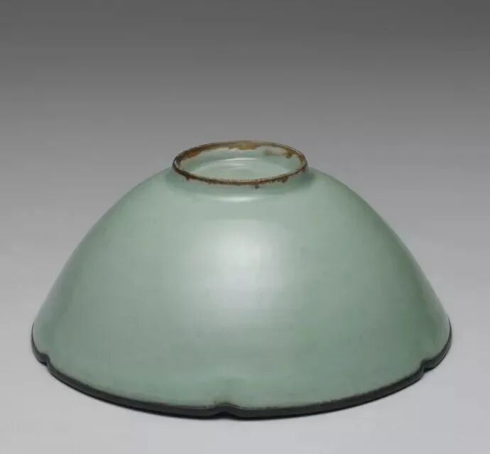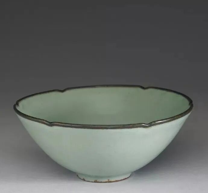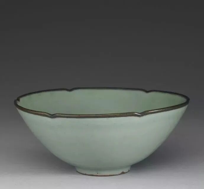 敞口,口沿呈六瓣花形并加嵌铜口,弧形深壁,小圈足,胎骨较薄,采用垫烧法烧制,圈足修饰平整,足端涂赭色护胎汁,磨损处可见灰白胎骨。内外施青色釉,釉层稍薄而匀净,口下些许淌釉痕迹。其造型端庄、釉色清丽雅致,是南宋时期龙泉窑中的佳作,相似制品可见于浙江宁波博物馆收藏,更有著名的日本东京国立博物馆龙泉窑马蝗绊葵口碗。