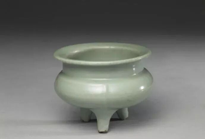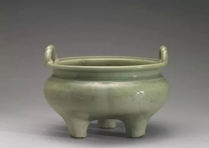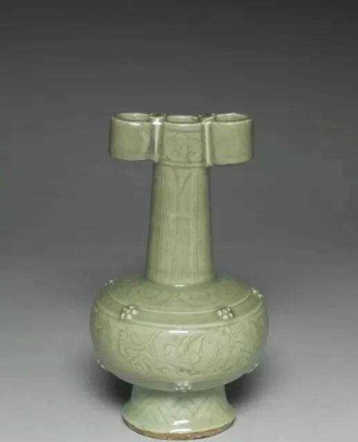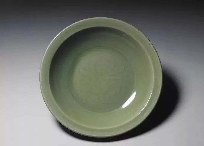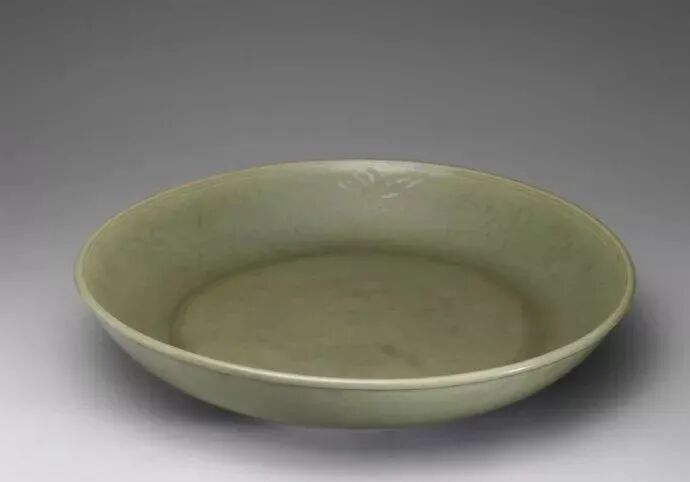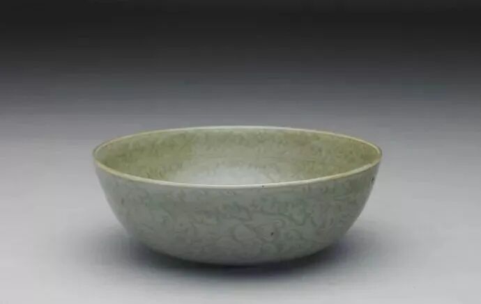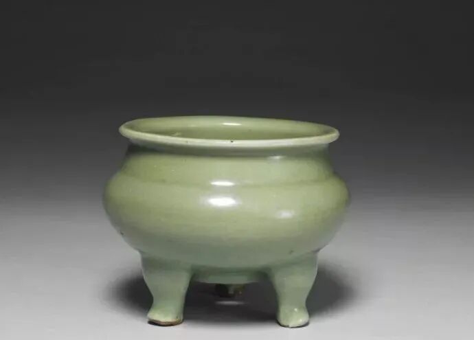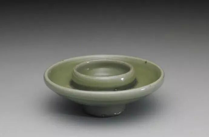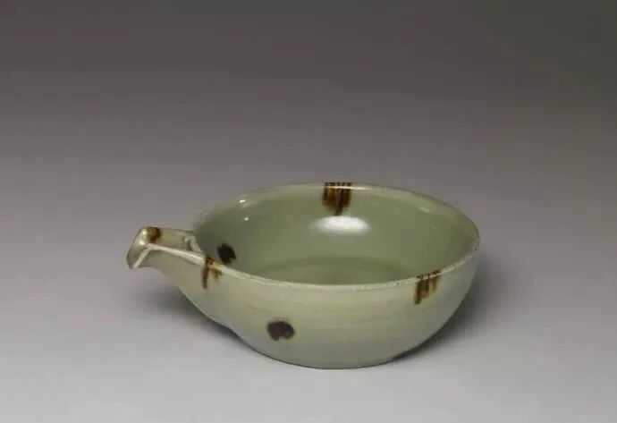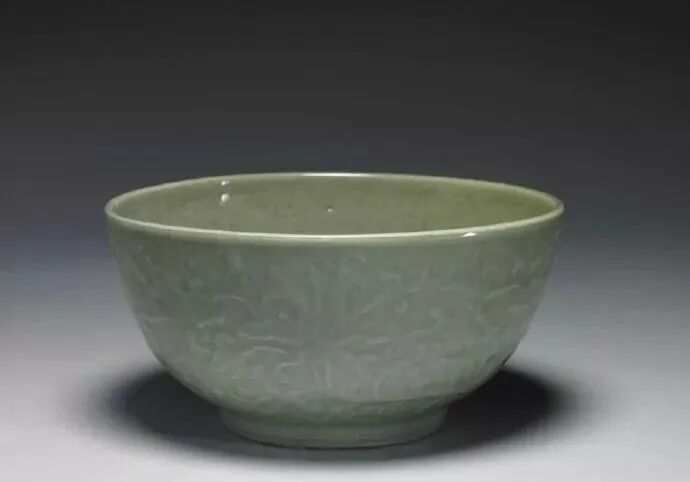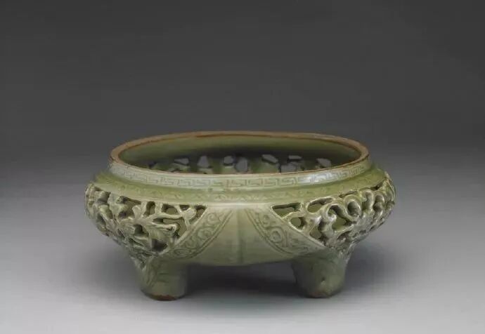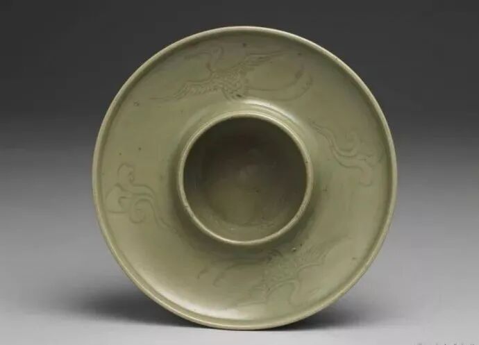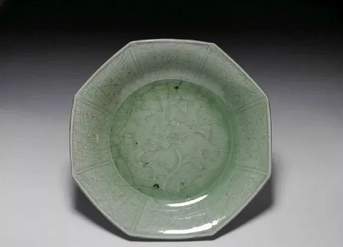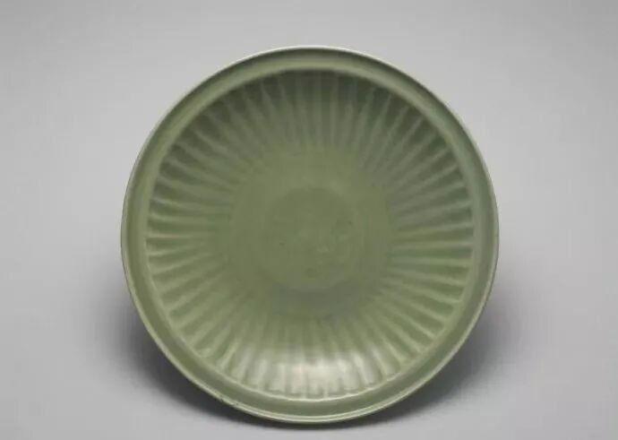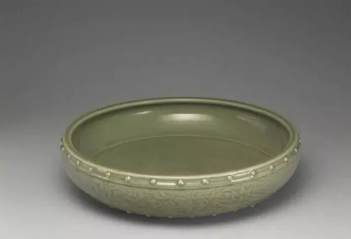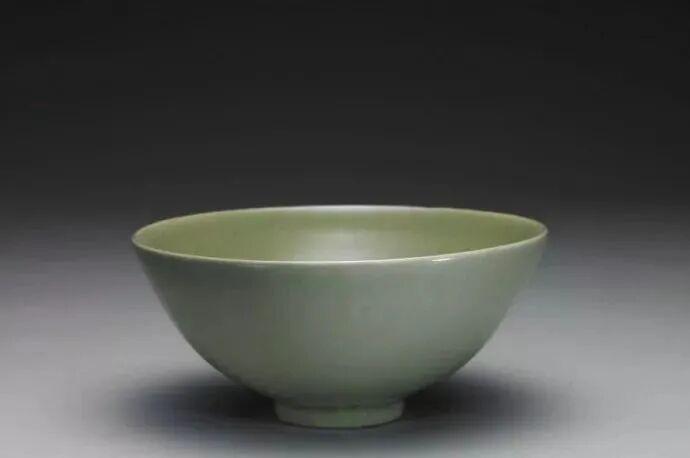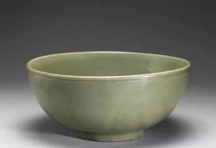 敞口,口沿呈六瓣花形并加嵌铜口,弧形深壁,小圈足,胎骨较薄,采用垫烧法烧制,圈足修饰平整,足端涂赭色护胎汁,磨损处可见灰白胎骨。内外施青色釉,釉层稍薄而匀净,口下些许淌釉痕迹。其造型端庄、釉色清丽雅致,是南宋时期龙泉窑中的佳作,相似制品可见于浙江宁波博物馆收藏,更有著名的日本东京国立博物馆龙泉窑马蝗绊葵口碗。