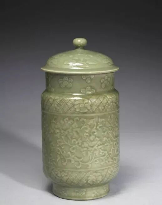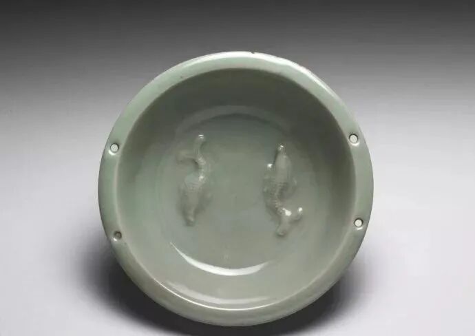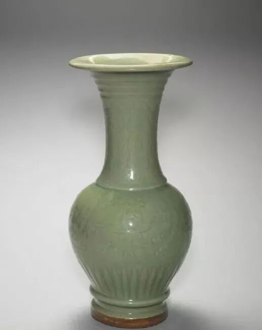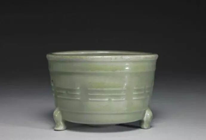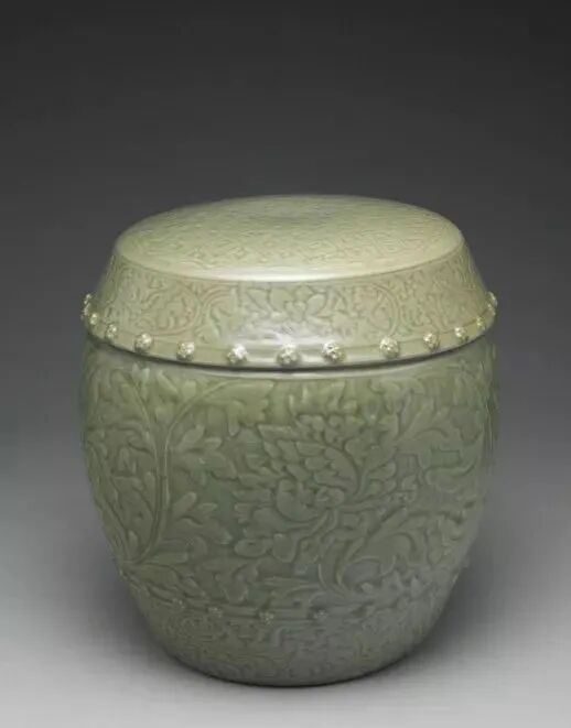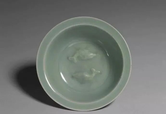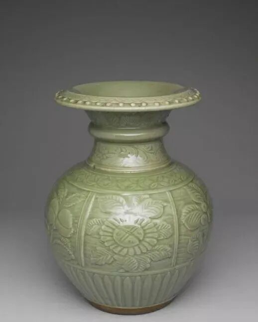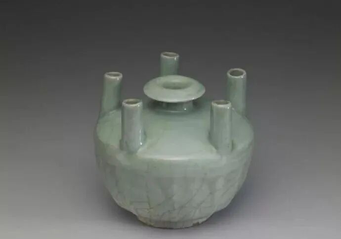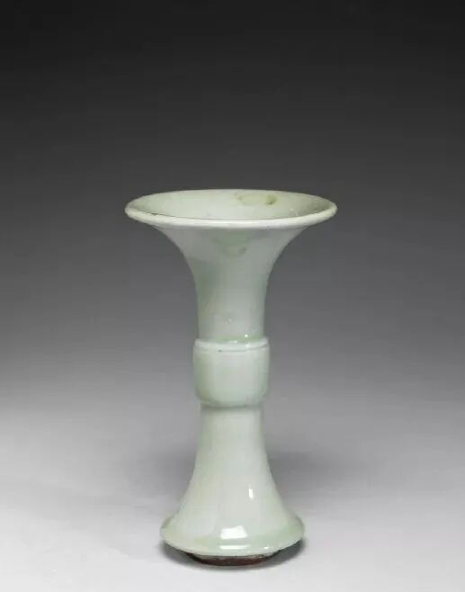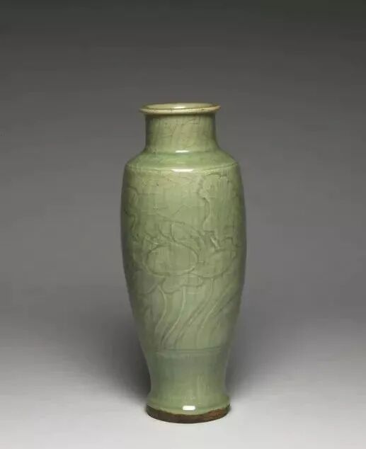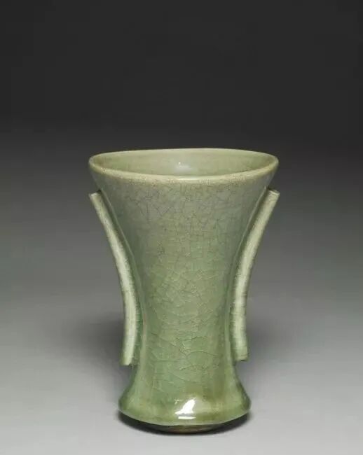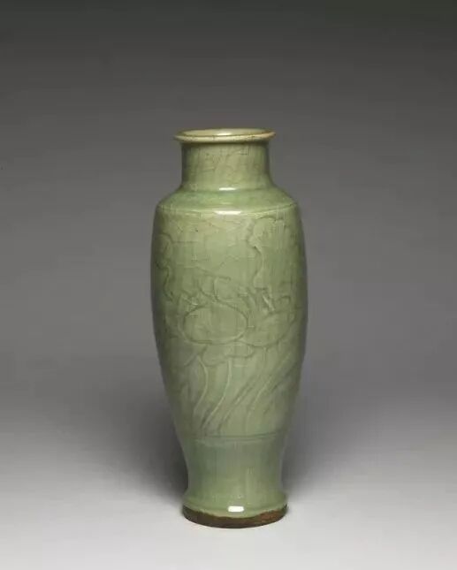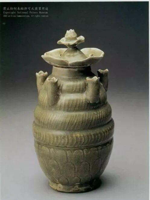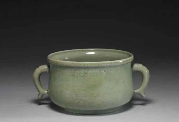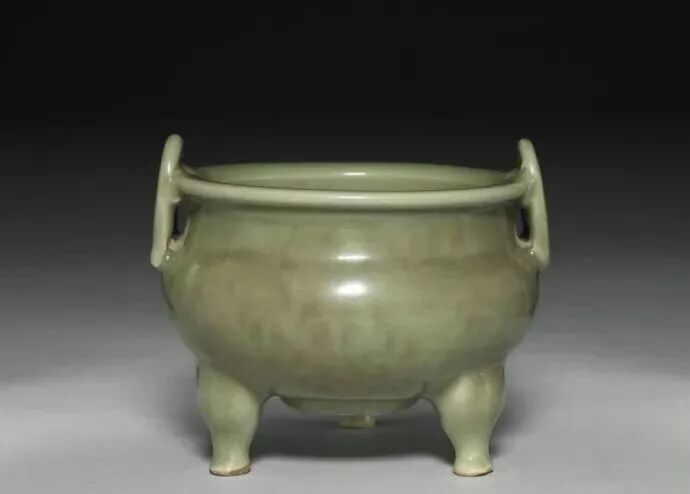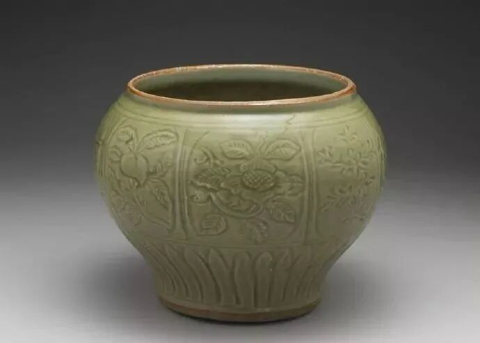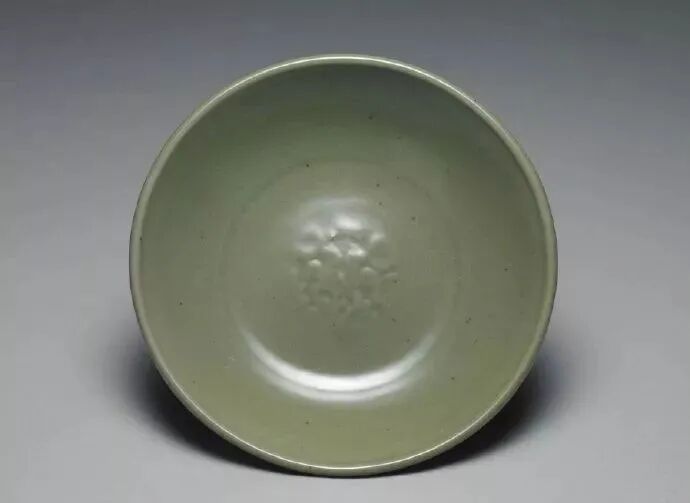 敞口,口沿呈六瓣花形并加嵌铜口,弧形深壁,小圈足,胎骨较薄,采用垫烧法烧制,圈足修饰平整,足端涂赭色护胎汁,磨损处可见灰白胎骨。内外施青色釉,釉层稍薄而匀净,口下些许淌釉痕迹。其造型端庄、釉色清丽雅致,是南宋时期龙泉窑中的佳作,相似制品可见于浙江宁波博物馆收藏,更有著名的日本东京国立博物馆龙泉窑马蝗绊葵口碗。