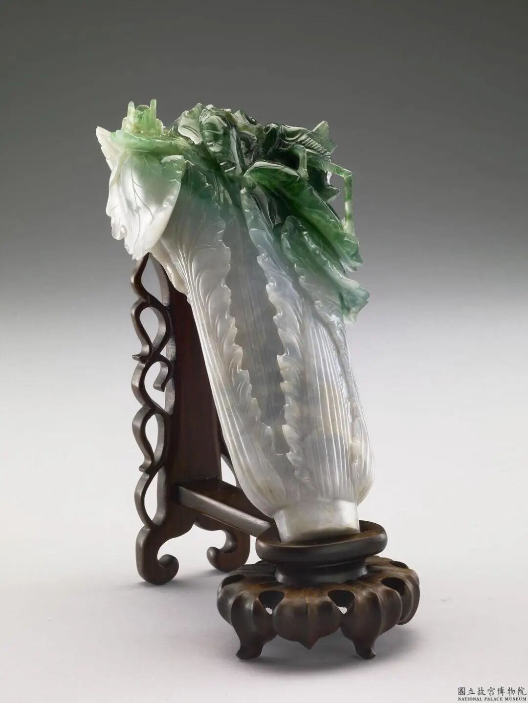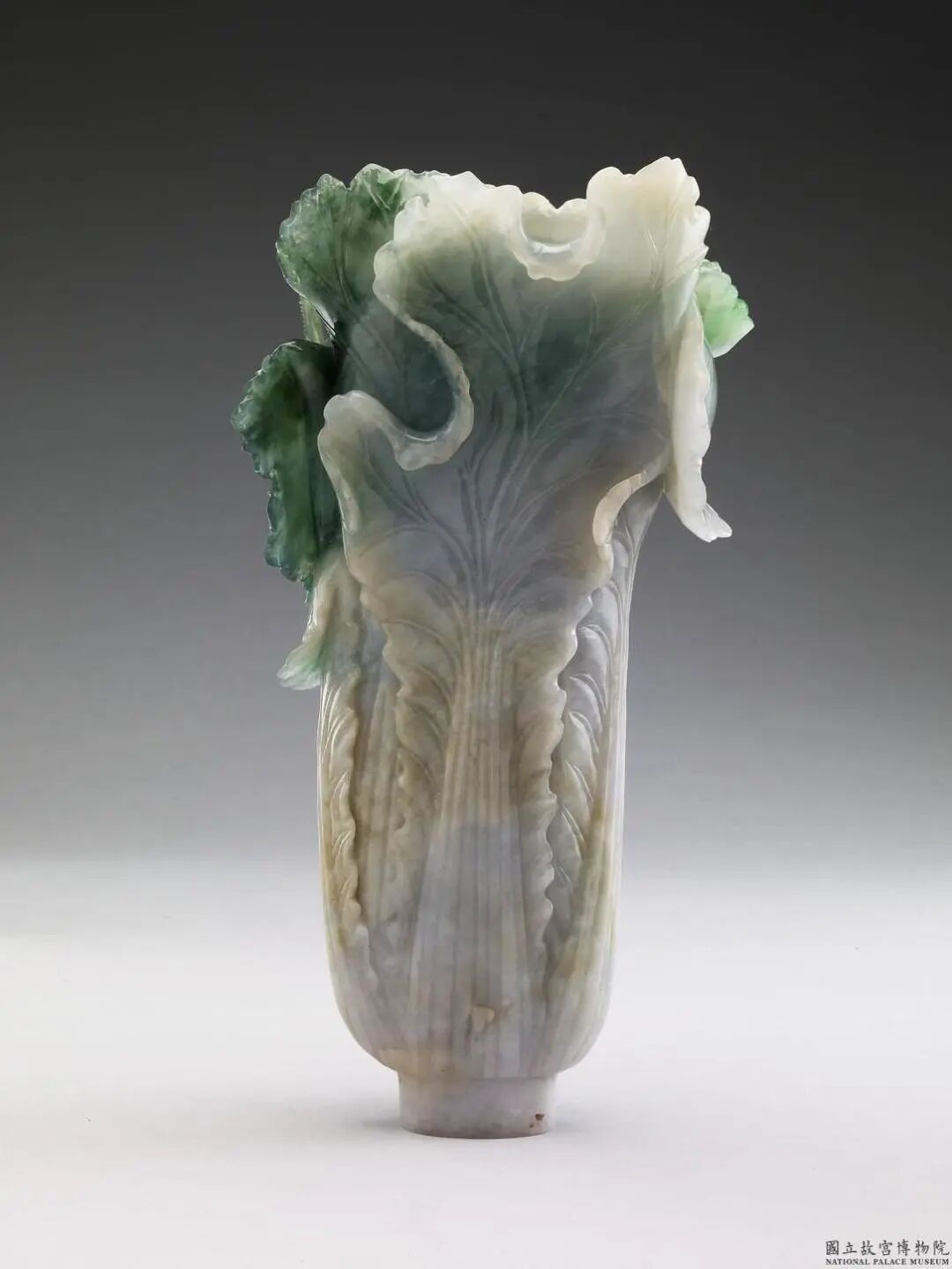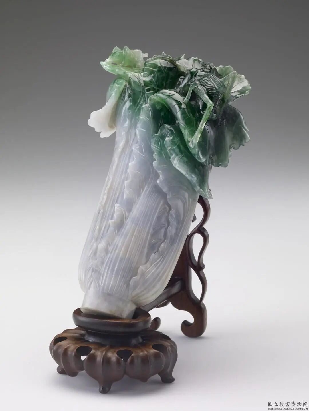 翠玉白菜是国立故宫博物院最受喜爱的藏品之一。工匠顺应翠玉天然的色泽,以浓重的深绿色表现层层包覆的菜叶;白色部分虽有裂痕及杂质,但在巧妙的安排下,转化为新鲜、饱含水分的白菜茎部。