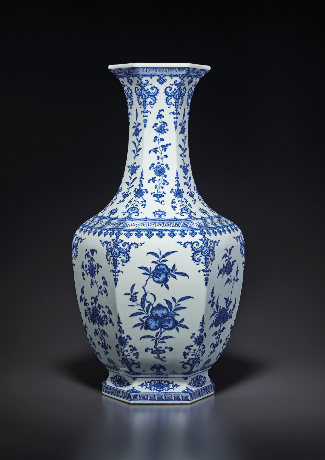 一尊清乾隆青花三多折技花果纹六方尊可谓硕中寓巧,精美绝伦:六方形瓶通体青花为饰,瓶腹以六种花果纹饰,六道绘以西洋巴洛克式卷草纹的棱线,纹饰中西合璧、上下呼应、画工精妙、气派非凡!