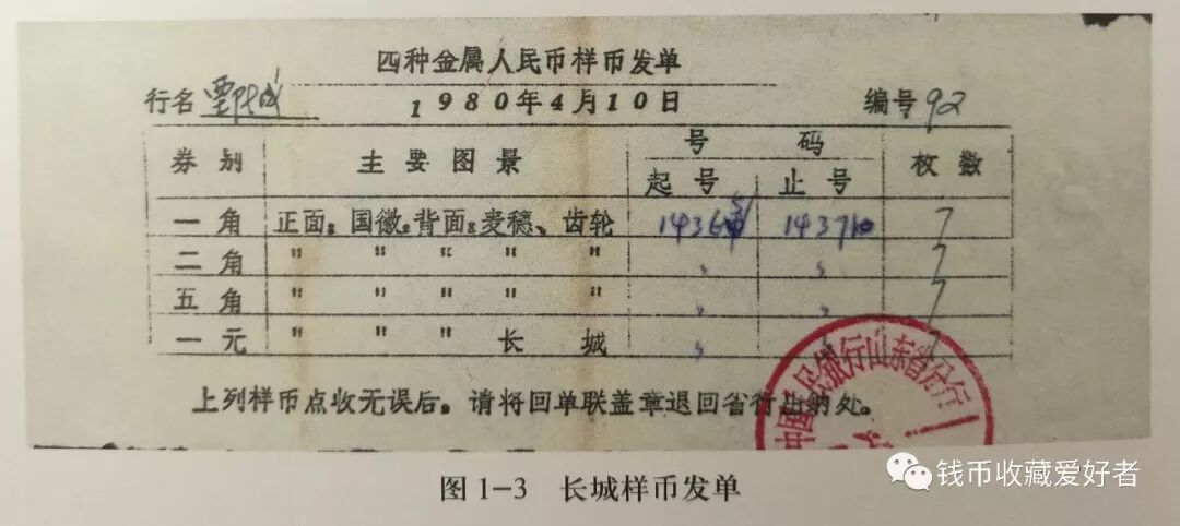2010年3月8日,一位收藏爱好者在网上出售小黑本包装和证书,陈志宏先生买下了全部25套证书(其中4本是空的小黑本、没有币),在一个小黑本中发现了一张纸,即“四种金属人民币样币发单”,发单的时间是1980年4月10日,长城币的发行时间是4月15日,意味着山东省人行是提前5天发放的样币,发单上盖有“中国人民银行山东省分行”的骑缝章,下联已经撕掉。