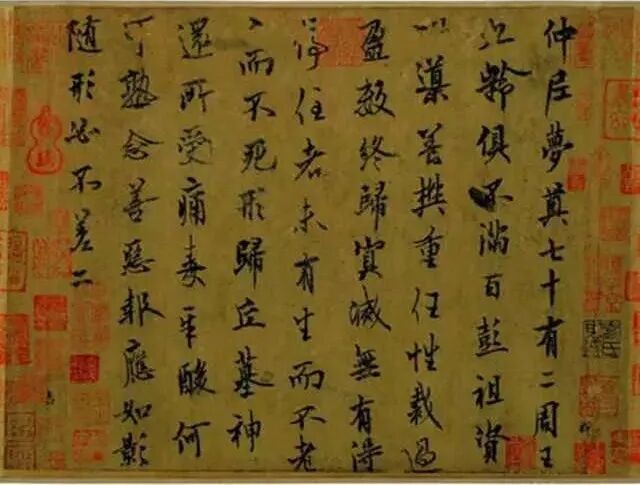 《自书诗》卷 (北宋),纸本,三接纸,纵28.2cm,横221.2cm,行书,故宫博物院藏。时年40岁,正不惑之年,中年蒙用,迟来还是不掩快意。着笔间令人直睹心境的轻快。通篇流畅自然, 沉稳端丽,婉约淡雅,蕴藉清隽。作起首行中带楷,十分用意,渐次流畅不拘,溢而为行草,最后挥洒为小草,越到后来越潇洒自如,后人评为:“此公第一小行书”。