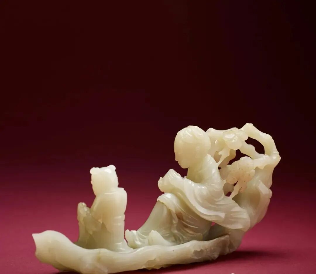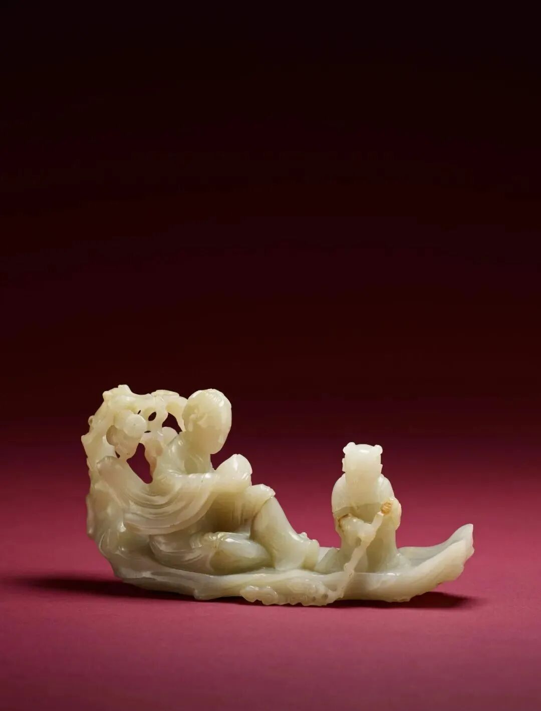 本品为清代乾隆朝白玉雕刻摆件,用料硕大、玉质细腻润泽,雕工精湛细腻,线条流畅利落。整件雕刻以麻姑乘槎为造型,麻姑所乘之槎,由虬松延展构成,镂空圆雕,十分精美。苍松衍变为船帆,蜿蜒曲折,独具匠心。而槎体又与云气融为一体,构思巧妙,令人称奇。仙女麻姑安坐于船尾,手执寿桃,俯瞰波涛,槎首有一半跪童子摇动船桨,船桨尾端连接如意云纹,有自天上送寿而来之寓意,当时必为相当贵重之贺礼,受礼之人必为宫中贵冑。乾隆朝的玉器特点通常体现在选料精严,再是纹饰多取吉祥题材,做工打磨更是一丝不苟;本雕件集上述特点,实为清代宫廷玉雕之珍品。