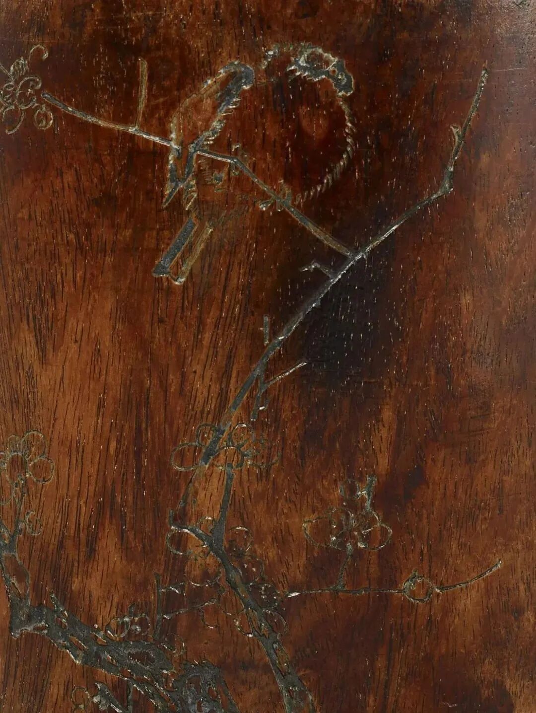 杜书绅为清中竹刻名家。此笔筒取黄花梨为材,刻喜上眉梢图,刀工细腻,韵味十足。布局妥贴自然,造型古朴大器,实为文房陈设之佳器。