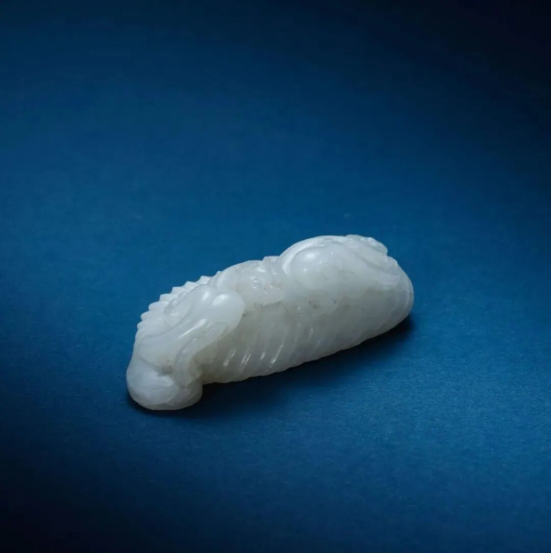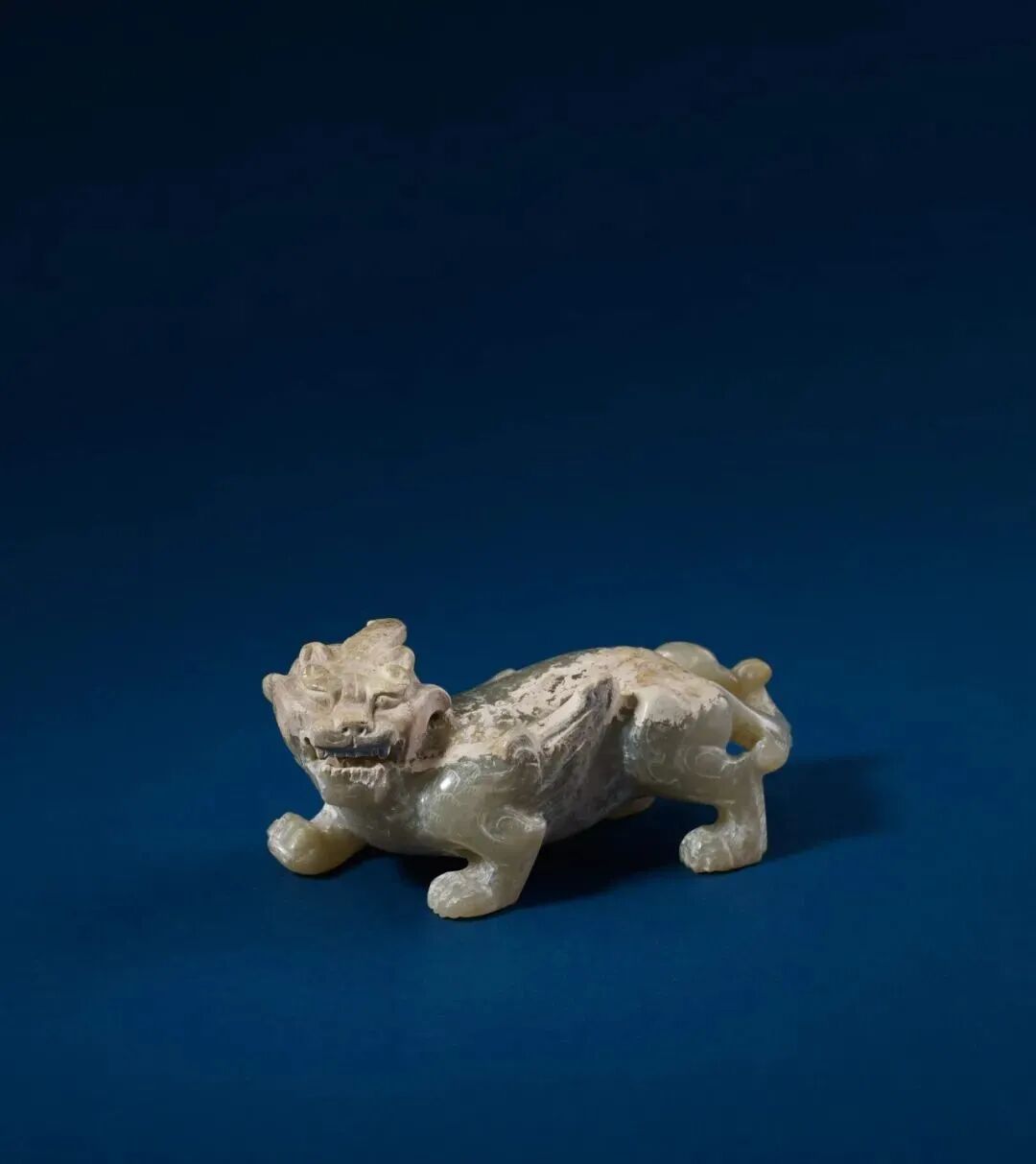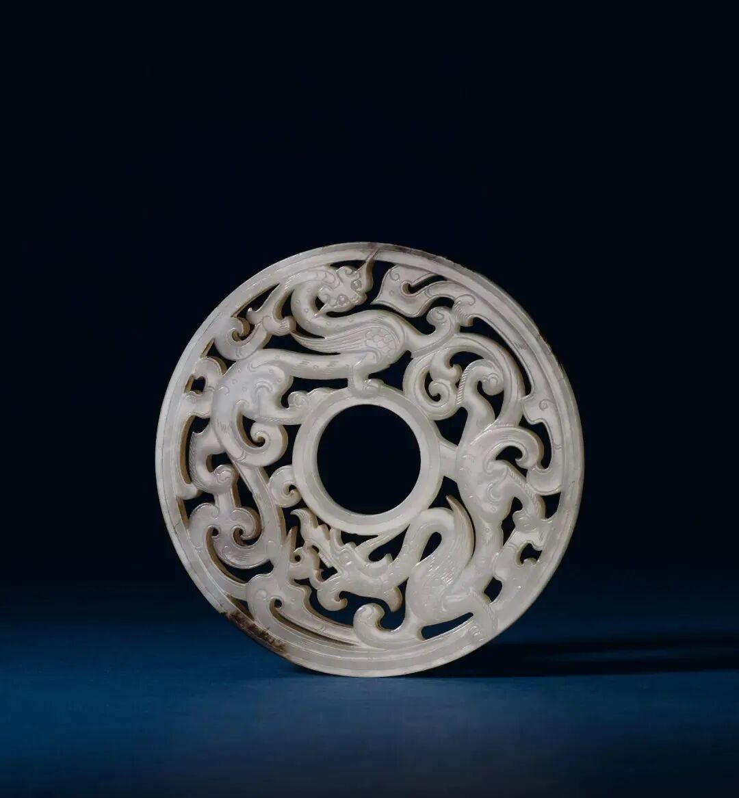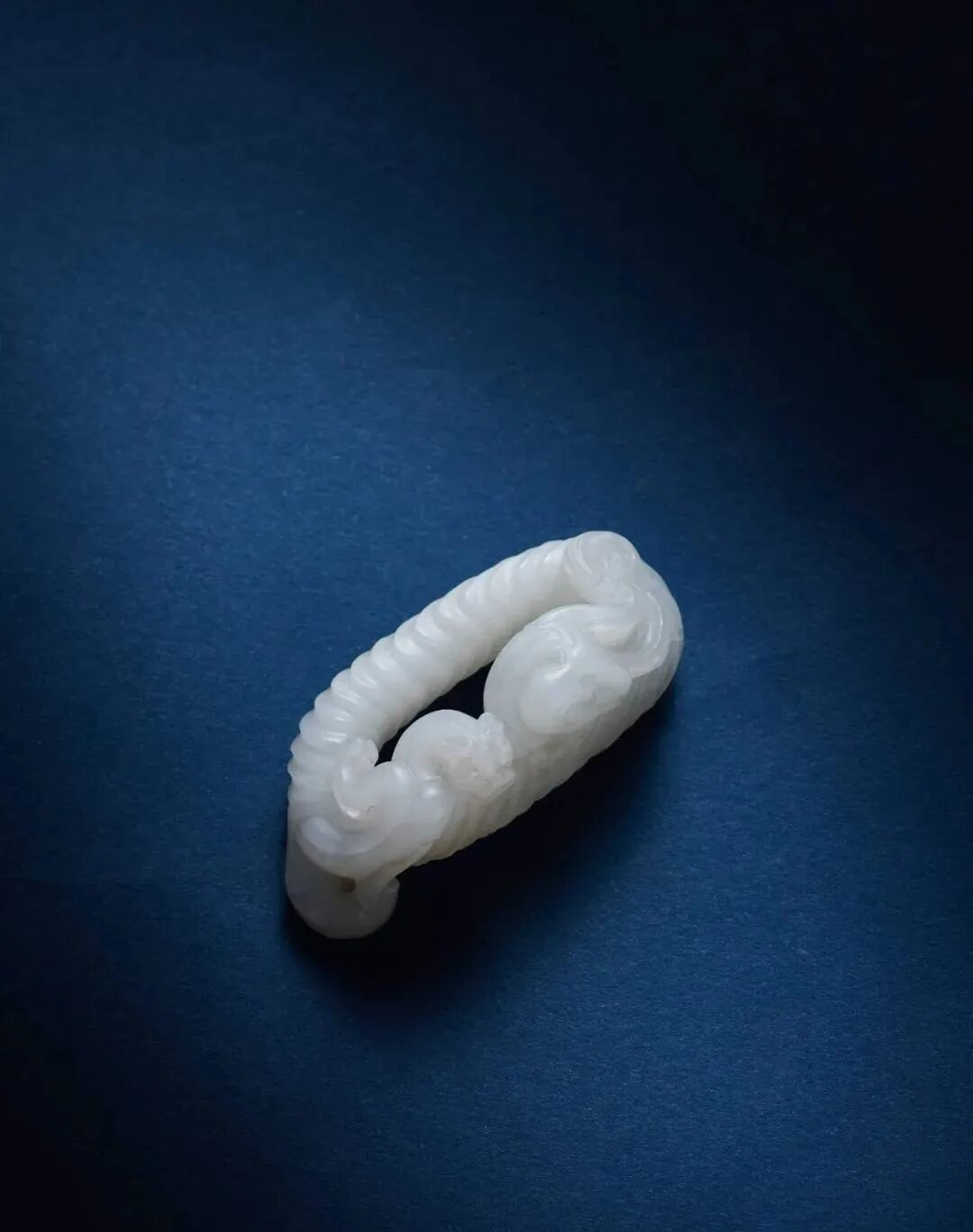 螭虎是战国之后玉器中常见的神兽,东汉蔡邕在《独断》中提到“天子玺以玉螭虎钮”。史书亦有记载:“初,汉高祖入关,得秦始皇蓝田玉玺,螭虎钮。”可见以螭虎为饰的器物自古便为王侯之用。本器为上等白玉质地,质地温润,器表有玻璃光泽。浮雕一螭虎神兽,身体自钮绳纹环中延伸环绕一圈穿出,与螭首相连。正面看似螭虎蟠卧,侧看又似兽身旋绕交缠,实为神虎穿绳而出,设计颇具抽象巧思。线条雕琢讲究,虎首凶猛霸道,四肢肌肉刚健浑厚,兽爪雄浑有力。虎尾长短对分,长尾亦成钮绳纹状,与绳环相连呼应。虎口有一穿孔,应为佩系之用。此器无论构图、形态或细部皆经过审慎的设计与雕琢,极度考验匠人的技艺,同类作品在目前考古数据与博物馆馆藏中亦未曾有见,其工艺与陕西历史博物院所藏国家一级文物汉代皇后之玺如出一辙,当初或为帝王或皇室成员所订制,似为孤品。