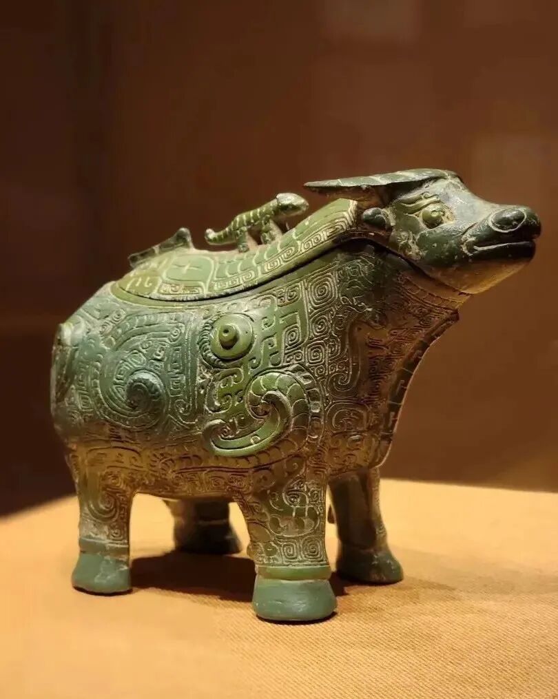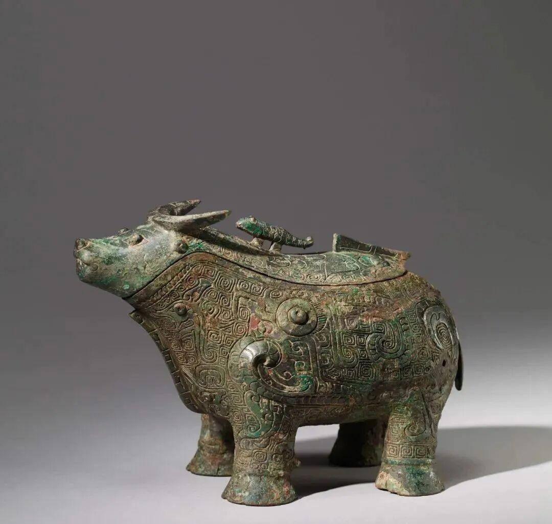此类牛觥存世罕见,至今不过五件,分别收藏于湖南省博物馆、上海博物馆、日本美秀美术馆,其余两件全身光素无装饰,见藏于美国哈佛大学艺术博物馆、日本私人收藏。学者研究指出,这类动物肖形觥多分布在商代南方地区,有别殷墟常见的装饰模式,意味着商代长江流域存在一个独立的青铜铸造中心,它们具有超高的工艺水平,并且时常与殷墟保有密切的联系、共享乃至交换。