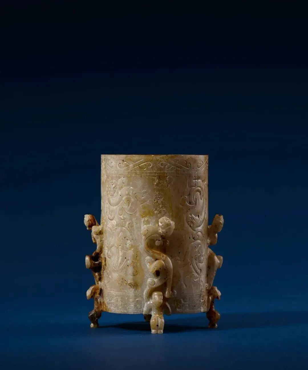 本器用整块的玉料雕刻而成,卮体取白玉为地,局部有黄褐色沁痕,玉质润泽。为圆筒形,直口,平底,并雕四个半蹲人俑作足,做俑抬卮状。俑上浮雕四只螭虎凸出卮身,螭虎作侧首伏卧状,怒目突珠,张口露齿,伸头,似在怒吼,细长弓背,卷尾竖起。平面纹饰变化错落有致,浅浮雕的螭龙与螭虎交替层迭,令人望之生叹。工艺上结合了透雕、高浮雕、镂雕、平雕、阴线刻等多种手法,反映了西汉时期玉器制作工艺的极高水平。