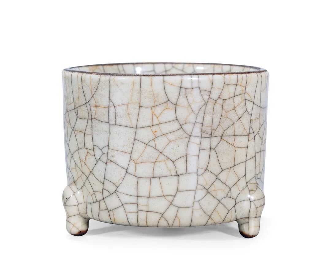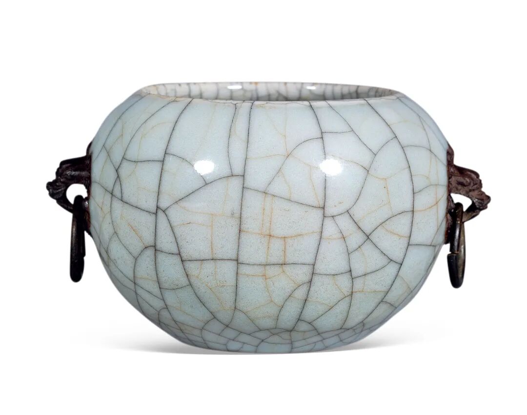 记载:“仿铁骨大观釉,有月白、粉青、大绿等三种。”数量在清雍正仿古釉中最多,造型也最丰富,文房器尤见精美者,本件拍品便为其一,葵口折沿笔舔。宋代官窑施釉较厚,釉质精细,釉面光润,成乳浊状,有玉质感。烧造温度稍高于汝窑,因此其釉面的玻璃质感稍强于汝窑。官窑釉色以天青色和淡雅的青绿色为上品,亦有粉青、翠青和月白等种类。釉面有较稀疏的开片,开片呈浅褐色,亦是这个窑口所独有的。这些宋代官窑的特点在此件雍正仿古笔舔上得到了完美提现,葵口亦是宋代常用形制。底部铁足十分规矩,胎中亦配了类紫金土,所以胎骨呈现除了宋代官窑特有铁黑色足圈,唯一区别是御窑厂对此件瓷器的底足进行了一丝不苟的旋削和打磨,因烧制水平的提升,胎釉结合处明显体现出了雍正瓷器对细节重视的特点。此笔舔疏朗而浅的开片亦为雍正时期仿宋代官窑的一大特点之一,亦在重现宋代官窑瓷器特点的同时体现了雍正朝素雅的特性。素雅为雍正帝不二之审美标准,与乾隆帝不同,雍正虽酷爱宋瓷,但不喜加入过多“个性元素”。综上所述,此拍品虽无款,但处处体现了雍正一朝仿制宋代官窑瓷器的特点,为不可多得的同时代代表精品之一。