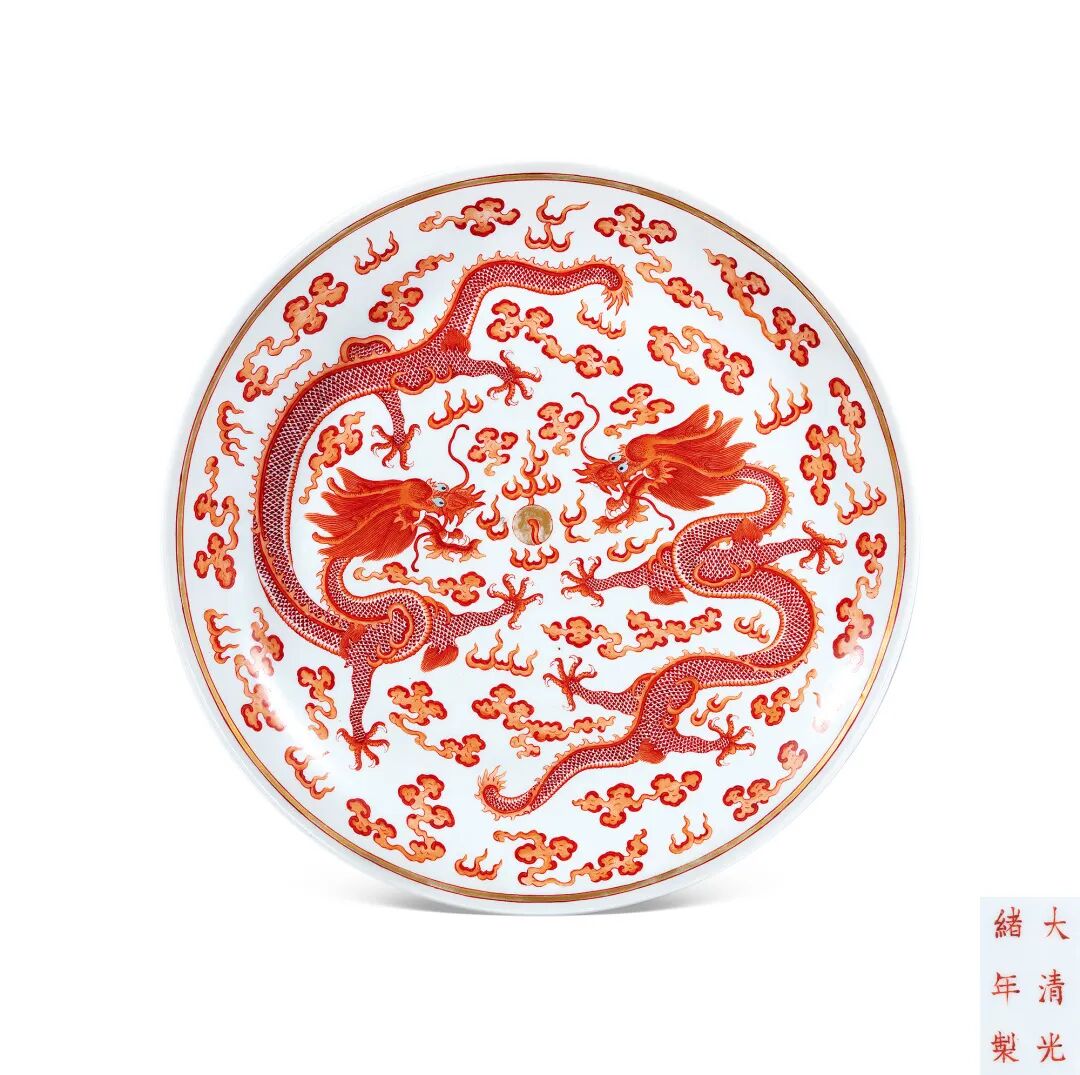 Lot35 清光绪 外矾红团龙纹内刻瓷花果纹盘(一对)