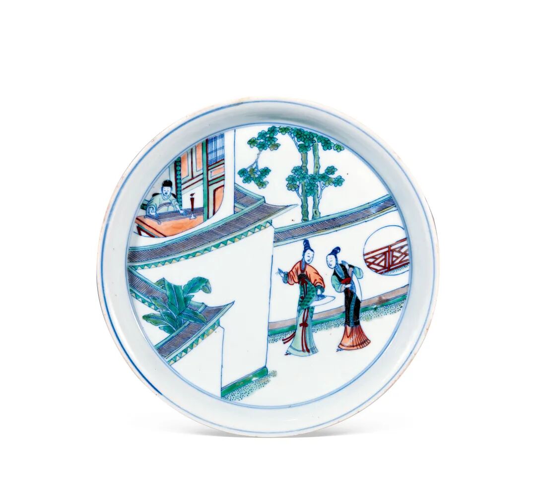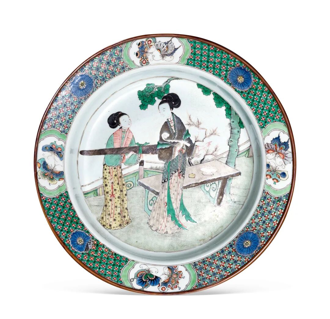 拍品估价:180,000 - 220,000 人民币拍品估价:300,000 - 400,000 人民币1.《故宫博物院藏文物珍品大系·五彩、斗彩》,上海科学技术出版社,1999年,页148,图136;2.《西藏博物馆藏明清瓷器精品》,西藏博物馆编,2004年,页89。Lot416 清康熙 五彩《西厢记》之莺莺操琴故事图折沿大盘拍品估价:100,000 - 150,000 人民币