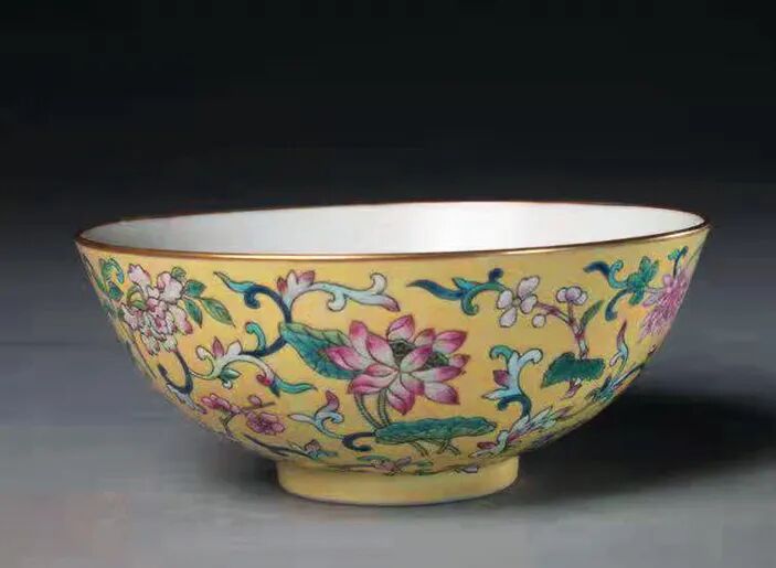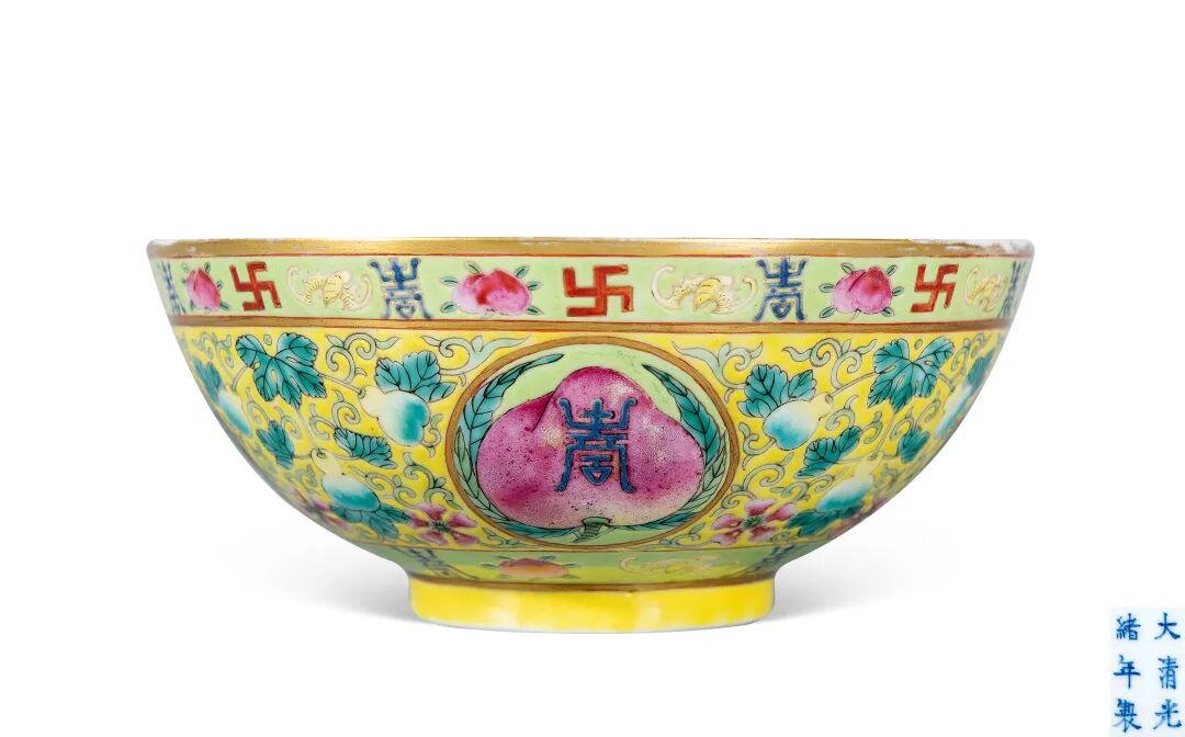 Lot197 清光绪 黄地粉彩福禄万代开光福寿纹碗