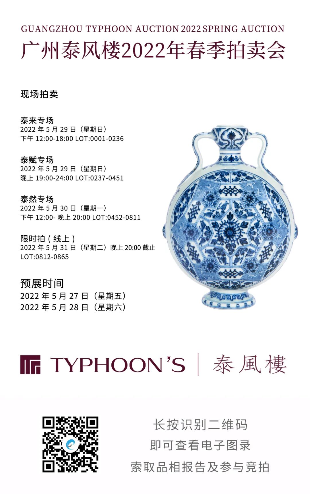 2021年5月,泰风楼实现了从网红古玩直播平台到实力拍卖行的华丽转身,一直以来秉承“感于物、精于质、耕于心”的理念,为广大藏友网罗高质量的明清瓷器艺术品。继成功组织2021秋拍首秀后,今年5月27日至5月30日,广州泰风楼又将带来一场大型的精彩春拍,展拍地点均位于越秀区东方文德广场二楼美悦盛宴巴塞罗那厅。本次春拍共设「泰·来」、「泰·赋」和「泰·然」三大瓷杂主题及四大专场,860余件珍品集中登场,既具品质,又成规模。联拍在线将全程直播,并提供实时同步竞拍技术和服务支持。重磅夜场「泰·赋」将由封面作品雍正御窑青花锦地纹绶带耳蒜头扁瓶和封二雍正御窑青花莲池游龙海水纹尊领衔,带来多件与重要馆藏相类的罕见珍品。同场的瓷珍名家专题将囊括王世襄、关善明、张仲英、马钱特、埃斯肯纳齐、仇焱之、徐展堂、洁蕊堂等多位海内外收藏名家的旧藏精品,来源清晰,传承有序,部分拍品更是首次出现在国内拍场。广州市店库出明成化渊明爱菊图瓷板、清康熙青花釉里红云龙海兽纹琵琶尊是「泰·来」主题的重点。此外,「泰·然」的多数拍品则将无底价上拍,品类丰富,性价比极高。Lot 356 清雍正 青花锦地花卉纹绶带耳蒜头扁瓶拍品估价:200,000 - 300,000 人民币1.《故宫博物院藏清雍正青花瓷器》,故宫出版社,陈润民主编,2017年,页196-197,图116;2. 香港佳士得,1995年10月30日,编号668;3. 香港苏富比,1996年4月30日,编号447;