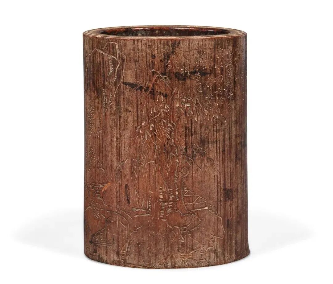 “山水清音,春秋佳日”竹雕诗文笔筒