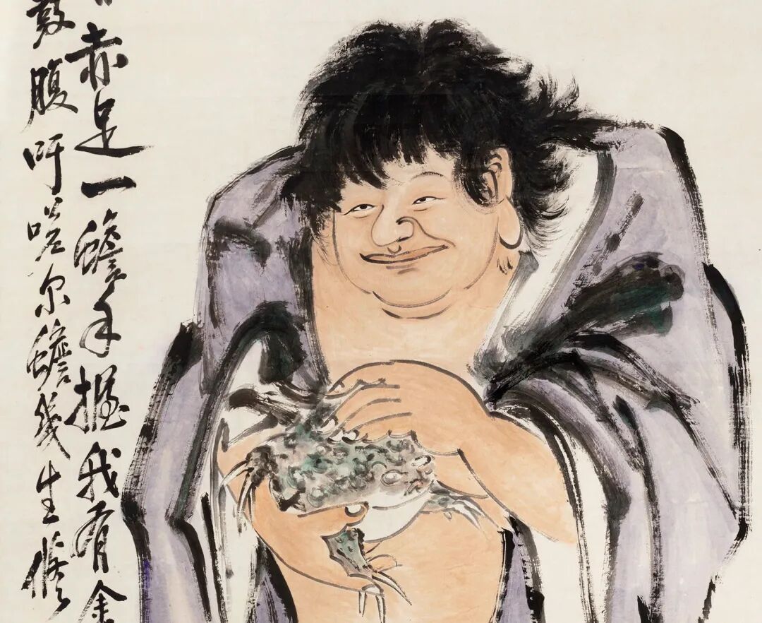 是幅《刘海戏金蟾》勾勒简劲传神,磅礡走笔,力透纸背,为王一亭同类题材人物画中之精制。作品外表粗犷而内蕴浑厚,奔放处见工整,精微处有气魄。在人物写照中得任颐精微处,又于写意笔墨中现吴昌硕风貌,挥洒奔放而又劲利,雄浑中寓有虚灵。