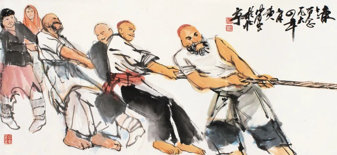 该幅《拔河》创作于1964年,黄胄精准地捕捉到了人物群体拼尽全力拔河的那一瞬间。整体手法简练、概括,去掉了许多繁琐的细节,弱化了明暗和体积感,重点突出了人物拔河时咬紧牙关、面红耳赤的五官神态,并灵活运用复笔增强运动感,将人们一个个脚蹬着地、身体后倾、拼命拽绳子的热烈气氛烘托了出来。笔墨灵动,人物造型充满动感,构图生动而饱满,少数民族的生活气息扑面而来。