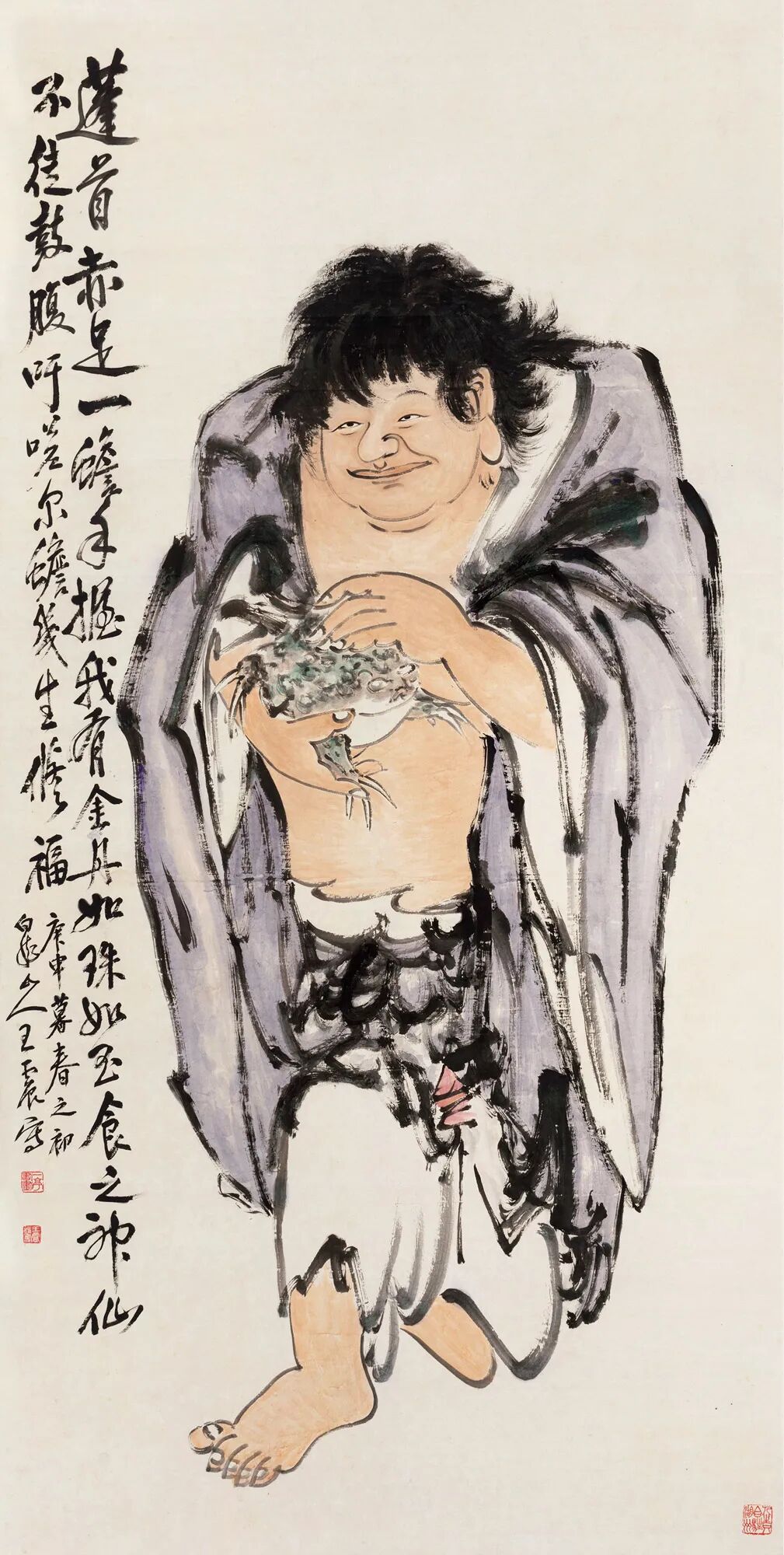 题识:蓬首赤足,一蟾手握。我有金丹,如珠如玉。食之神仙,不徒鼓腹。吁嗟尔蟾,几生修福。庚申暮春之初,白龙山人王震写。