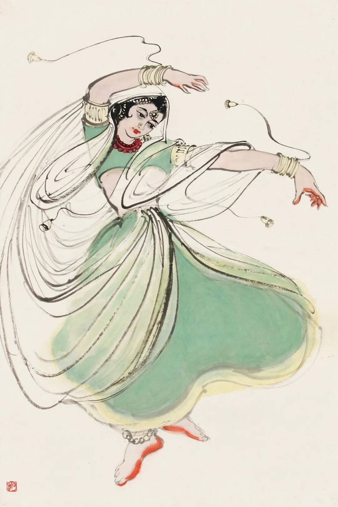 这幅《印度舞女》,寥寥数笔,一个形象饱满、精气神毕现的印度舞女形象便跃然纸上。舞蹈是通过演员的肢体动作语言来传达其精神内涵的,故而石鲁删繁就简、取其大要,在五官、装饰上,仅以墨线简单勾勒,而于衣裙处理上重点着墨。画家用笔轻重缓急,交替自如,使线条产生藕断丝连之感,连绵蜿蜒的线条烘托了舞姿的娉婷袅娜,令人心旷神怡。