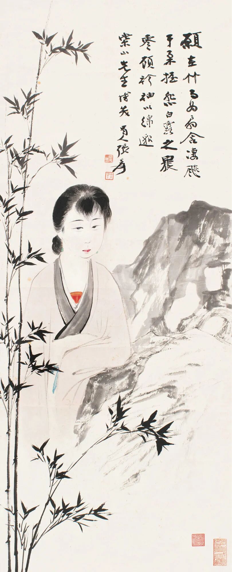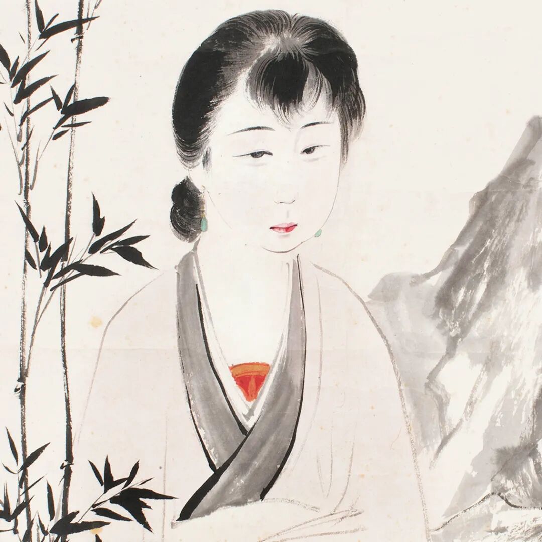 此幅为大千早年笔下仕女之典范,虽少了些中期作品中雄厚苍浑之感,但仕女面貌清新秀丽,弱质芊芊,媚而不俗、秀而不佻,别有一番味道。修竹掩映间,但见仕女倚靠湖石,凝神细思,营造出一种清幽绝尘的古典氛围,也映衬出人物娴静、优雅的古典气韵。仕女面容清秀,细目小口,楚楚动人,双目凝视若含无限幽思。发髻钩皴细致,颇有质感;衣纹的行笔也自由流畅,更突显仕女轻盈婀娜的体态。全画工写结合,悦目中含飘逸之趣。