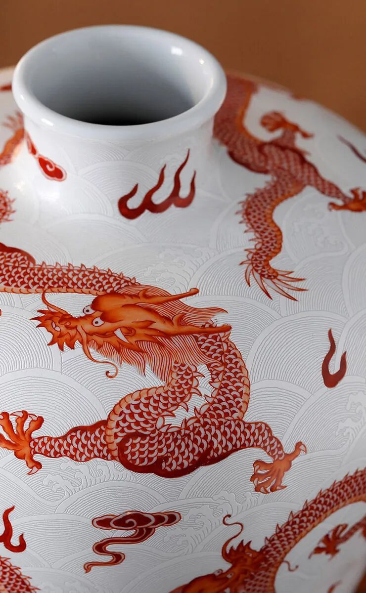 清乾隆·白地轧道海水矾红九龙闹海图大梅瓶#本品釉色纯美,整器绘工、刻工均无可挑剔。lot4005