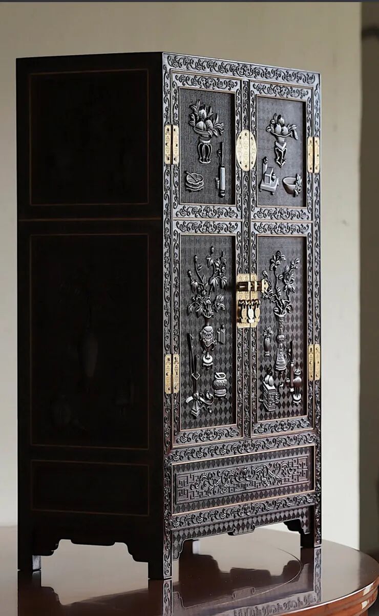 大雅堂赞比亚紫檀博古茶柜#此系复刻清中期藏柜,整柜满雕锦地纹,浮雕博古花卉图,精致而实用。lot3004