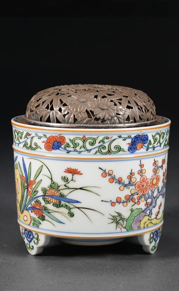 昭和·四代三浦竹泉造彩绘四君子图银盖香炉#本器器形敦实厚重,彩绘文雅别致,具日和风情。lot5003