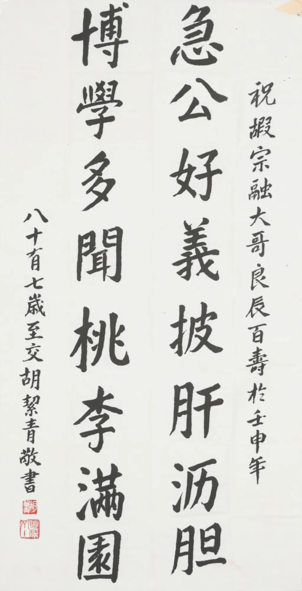 急公好义披肝沥胆,博学多闻桃李满园。祝嘏宗融大哥良辰百寿,于壬申(1992)年。八十有七至交胡絜青敬书。