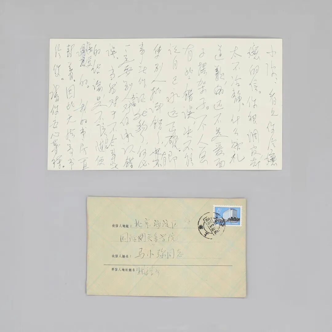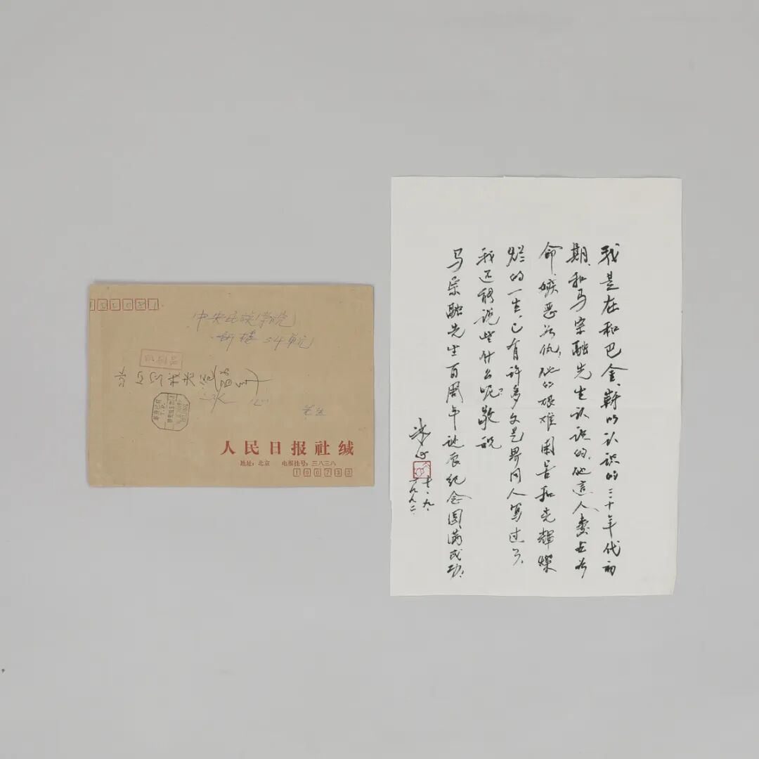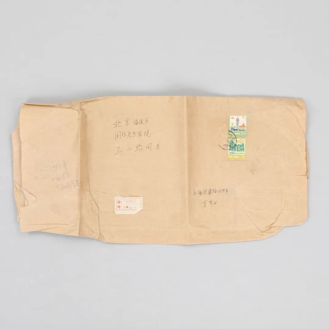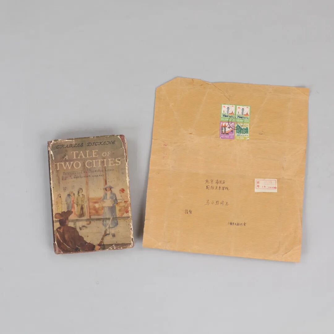 附巴金亲笔信封一枚,上有“挂刷。北京海淀区国际关系学院,马小弥同志,上海市文联,巴金”字样。背面有马小弥备注“1982年1月,李伯伯寄来英文双城记”。