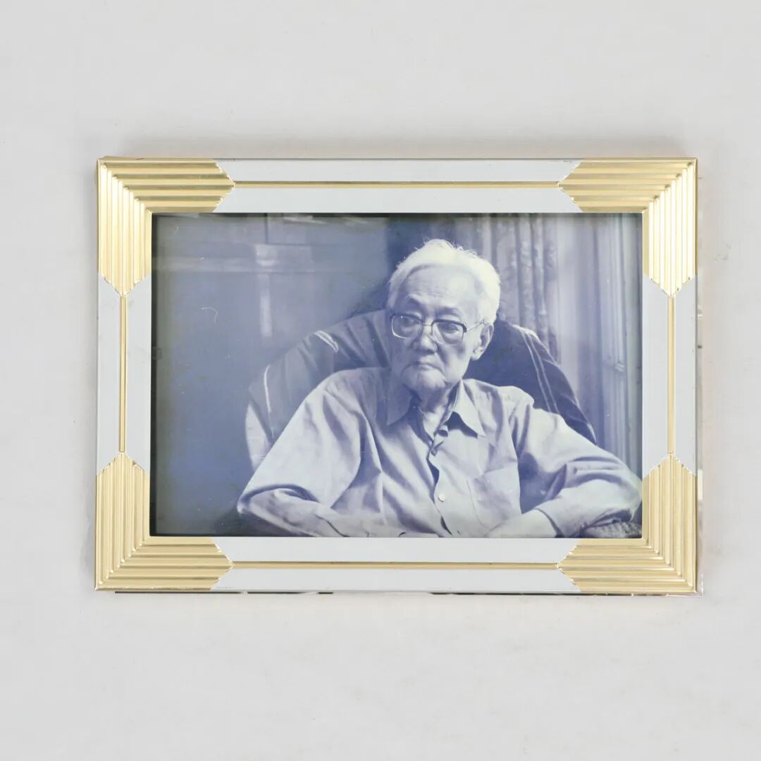 我抓紧时机迅速布置好三脚架和相机,跪在客厅上对准巴老测光调焦,这时,家里人在一旁对着巴老高声喊了一声:“该吃药了!”巴金由于身体虚弱,听到喊声后反应迟缓,只见他在那一刻把眼光往侧面一瞥,露出炯炯有神地目光,加上窗外投进的阳光正好把老人的白发映成了一脉巍峨的雪山。恰好展现出他一生嫉恶如仇和爱憎分明的鲜明个性。”