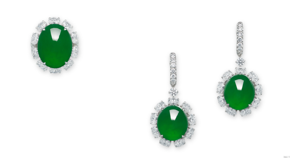 由三颗种色相近的高品质蛋面组成,佐以璀璨钻石,翠色在璀钻的光芒中启承婉转,颇有柔中带刚的美感。