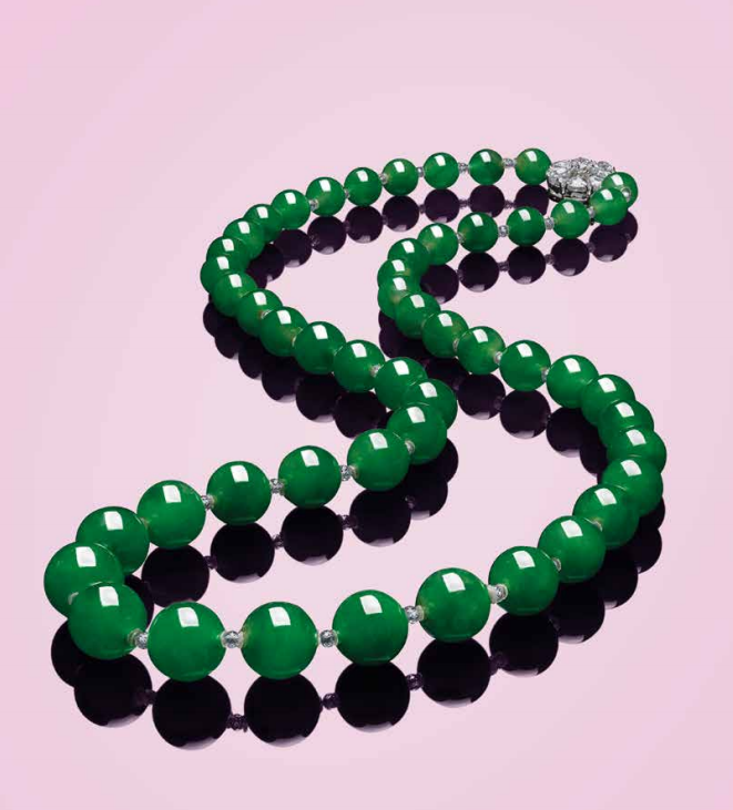由51颗翡翠珠子串成的珠链,珠子尺寸略小,种水色整体离玻璃种帝王绿较远,但胜在珠子数量较多,也具备一定的升值潜力。