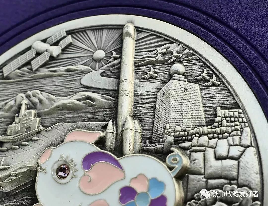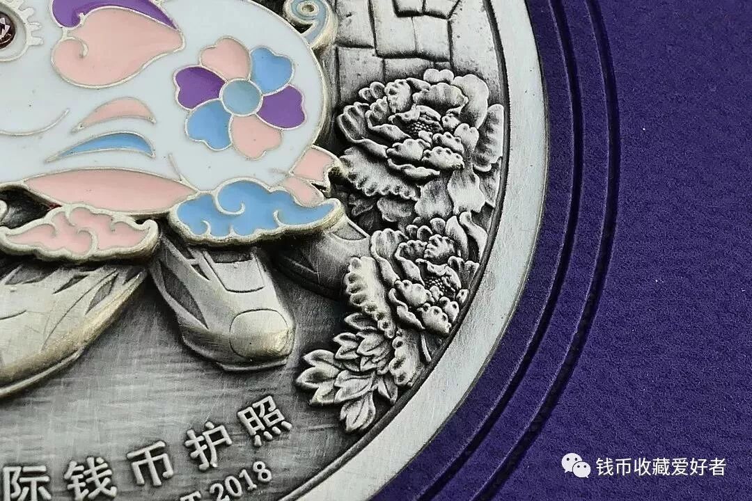 该护照封面镶嵌有圆形银质纪念章一枚,含纯银5克,直径54毫米,成色99.9%,采用浮雕做旧和局部银胎画珐琅等制作工艺,细润美观,立意新颖,于古朴雅致中融合了现代时尚的元素。